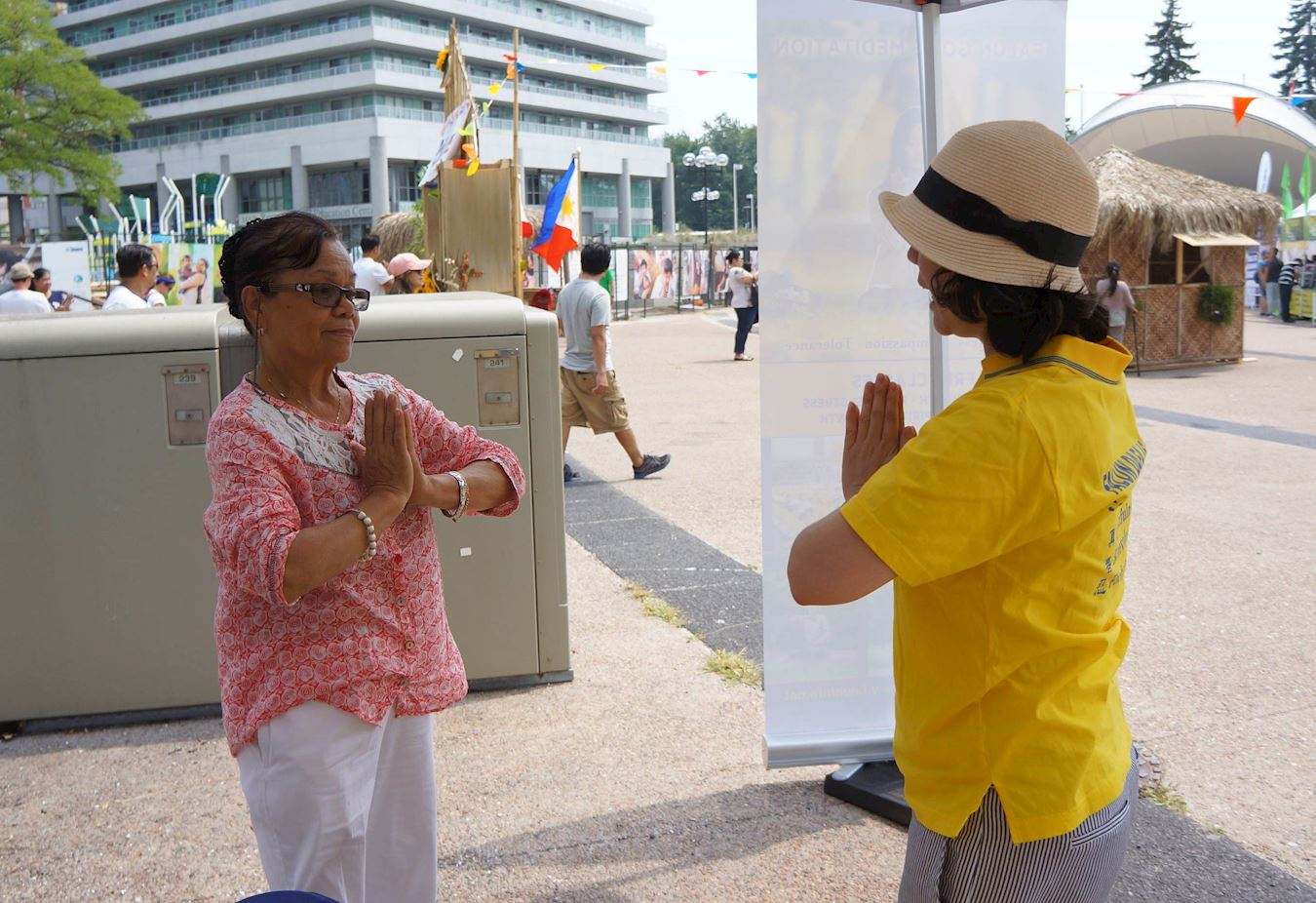 彻可·德玛(Chirky Delmar)女士是菲律宾移民,也是一位单身母亲,目前在多伦多从事房地产方面的工作。周日下午,她带着自己的小儿子来到介绍法轮大法的展位。她对法轮功非常感兴趣,稍作了解后,决定立即体验一下。在学习第五套功法打坐时,她向学员表示,一个人带着孩子还有自己的工作压力很大,大脑总是放松不下来,之前也尝试过几次打坐,但不是想要睡过去了就是杂念太多,很是苦恼。她非常想学习一种方法来放松自己。在学习完第一套、第二套和第五套功法后,她感觉非常好,留下了了自己的联系方式,准备参加八月中旬由当地学员组织的九天法轮功学习班。