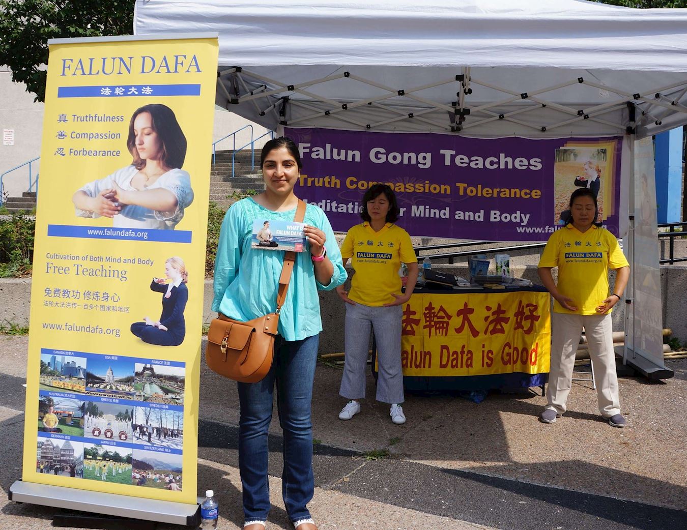 周六上午,学员刚刚布置好展位后,赛达(Sadaf)女士就走过来好奇地询问这是做什么的。赛达是在多伦多出生和长大的巴基斯坦移民,一直喜欢了解不同的文化。得知法轮大法是佛家的上乘修炼功法,对身心都非常有益后,她非常感兴趣。给她介绍法轮功的一位年轻学员表示,通过修炼,不仅身体素质变好了,更重要的是,自己的道德得到了升华,变成了一个更有善心,更宽容的人,少了很多杂念,多了很多智慧。赛达表示非常赞赏,说不仅是大人,现在的年轻人甚至小孩子也需要法轮功,现在的年轻人很浮躁,容易被社会上的一些不良习气所带动,人们应该从小就注重道德品质的培养。她觉得法轮大法能做到这一点真是太好了。赛达表示回家后要好好了解一下法轮功,并且想让自己十几岁的侄子侄女也了解一下。