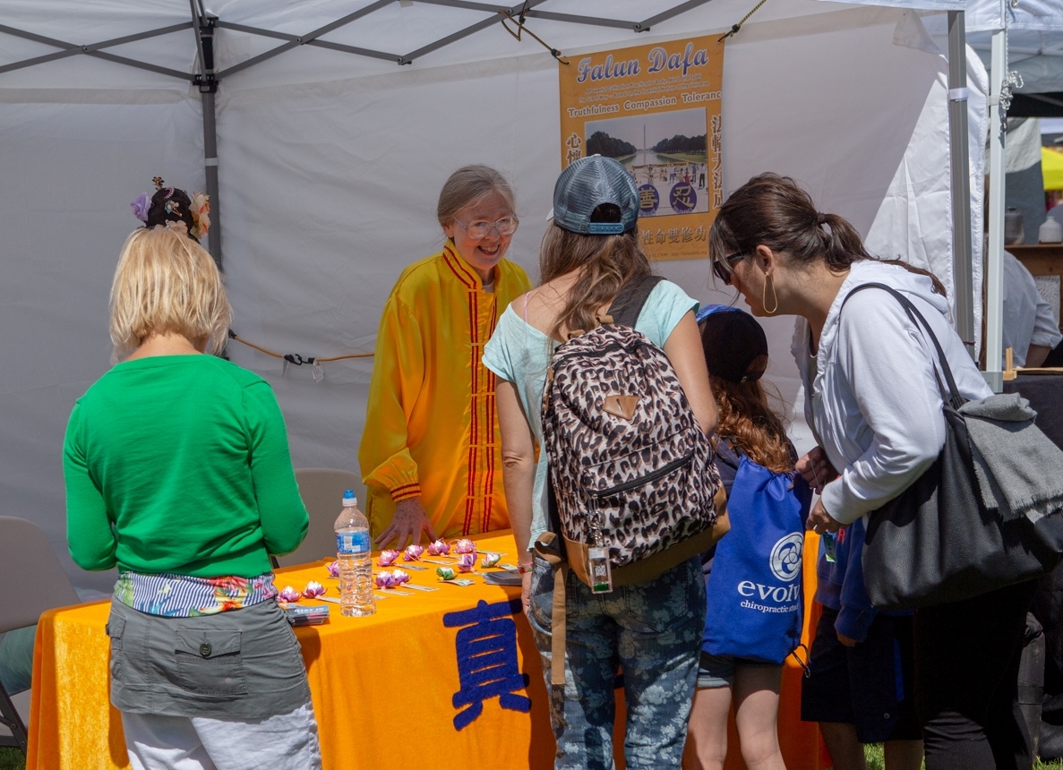 除游行外,在四日、五日的繁华街会中,法轮功学员的真相展位深受社区民众的喜爱,前来询问、关注、签名声援反迫害的民众很多。