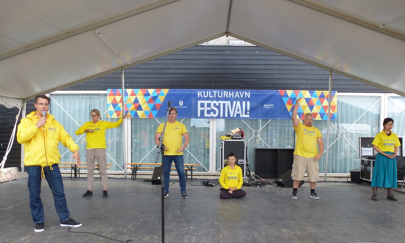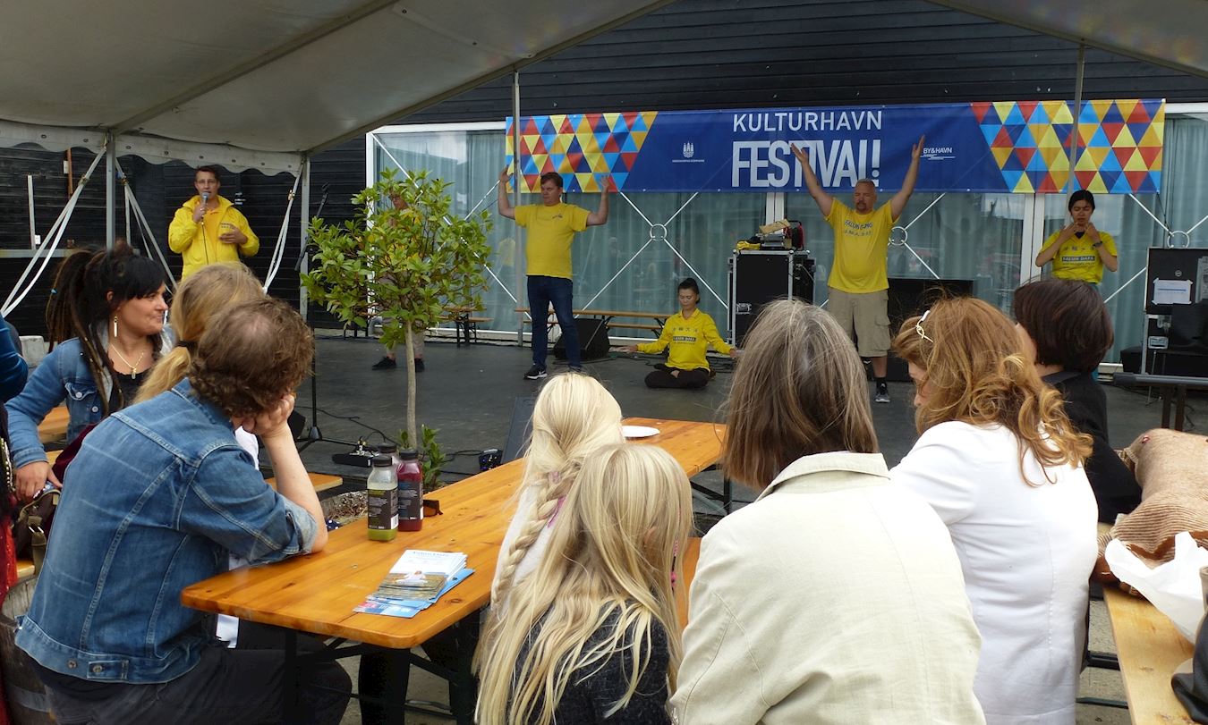 ![]() 图1:法轮功学员在丹麦首都哥本哈根海港文化节的舞台上演示功法 |