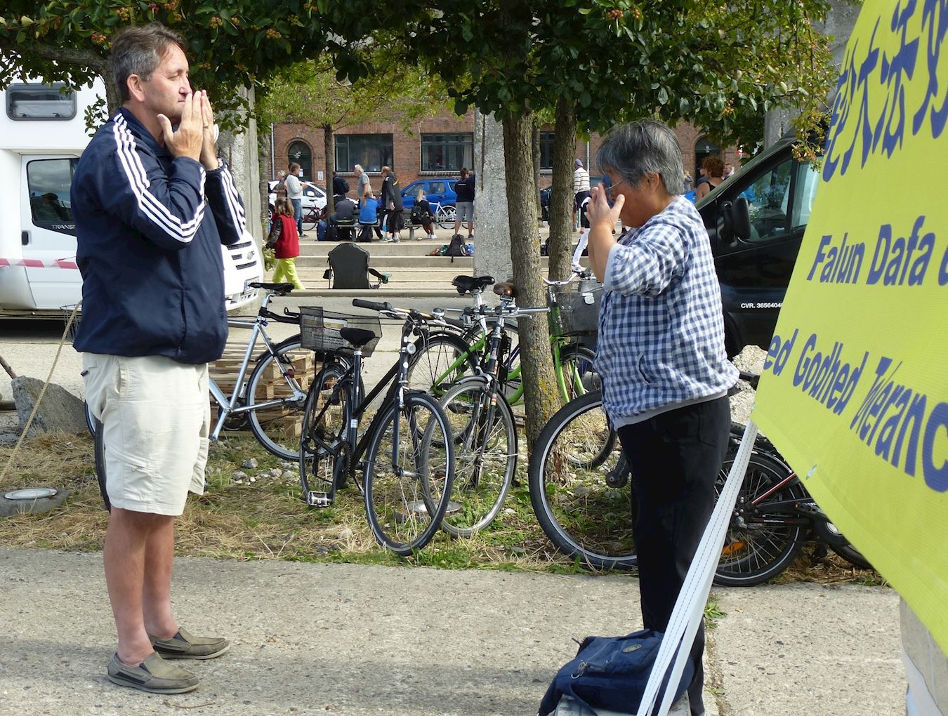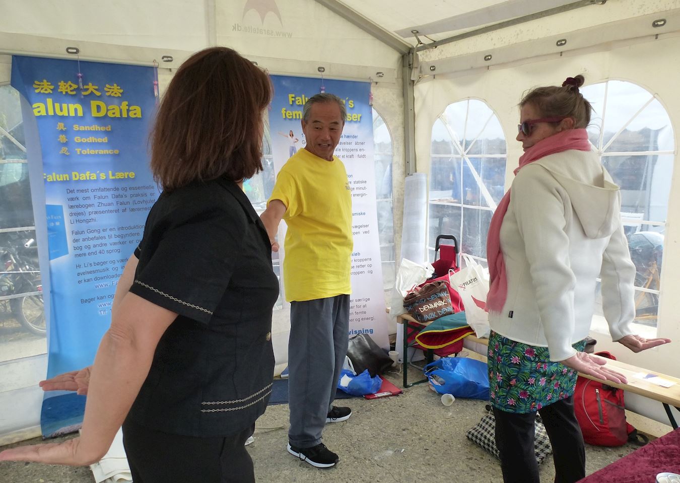 三天时间里,来到法轮功学员帐篷旁的人络绎不绝,许多人长时间地与学员交谈,了解法轮大法。学员们除了讲真相,发传单以外,有时还需要同时在帐篷内外分成几组同时教功法动作。