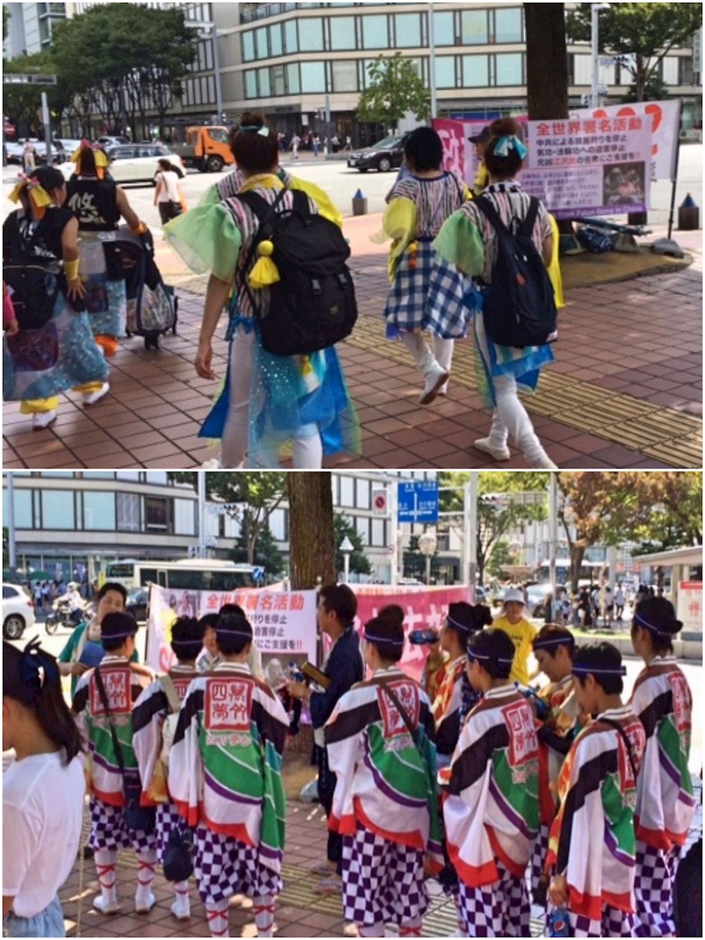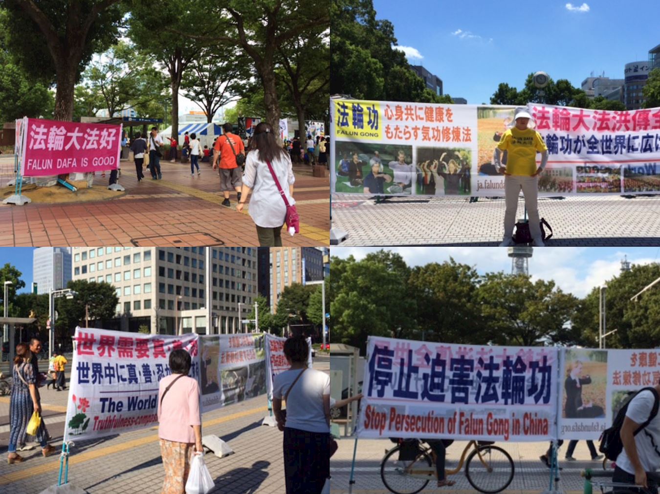 法轮功学员们在醒目的位置打出了“法轮大法好”、“法轮功弘传世界”、“停止迫害法轮功”、“SOS全世界署名活动 中共立即停止活摘器官 声援举报迫害法轮功的罪魁祸首江泽民”等中英日文内容的横幅,过往的人们从很远就能看见。