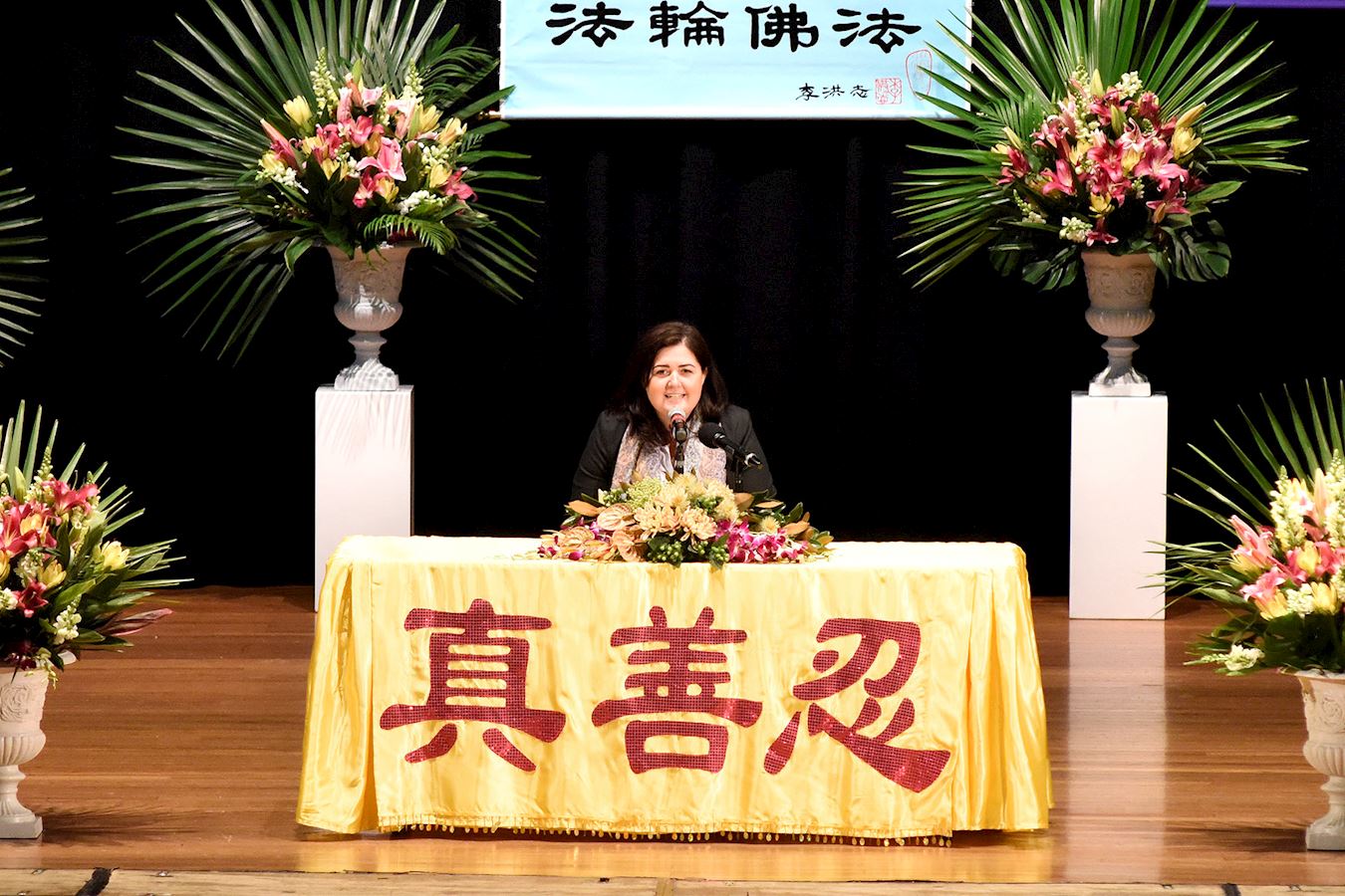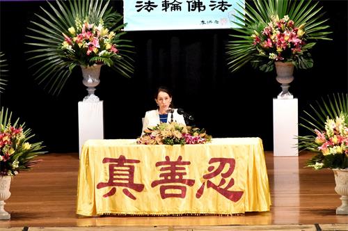西人学员路易斯(Louise)在法会上交流了她在协调今年昆士兰大法弟子与各界来宾共庆世界法轮大法日活动中的修炼心得。她找到了在遇到不符合自己观念的事物时容易产生负面想法的执著心,包括争斗心、显示心等,以及去掉这些人心后,同修们整体配合,放下自我,互相尊重,圆容各种好的建议的正念正行,最后使活动圆满成功。