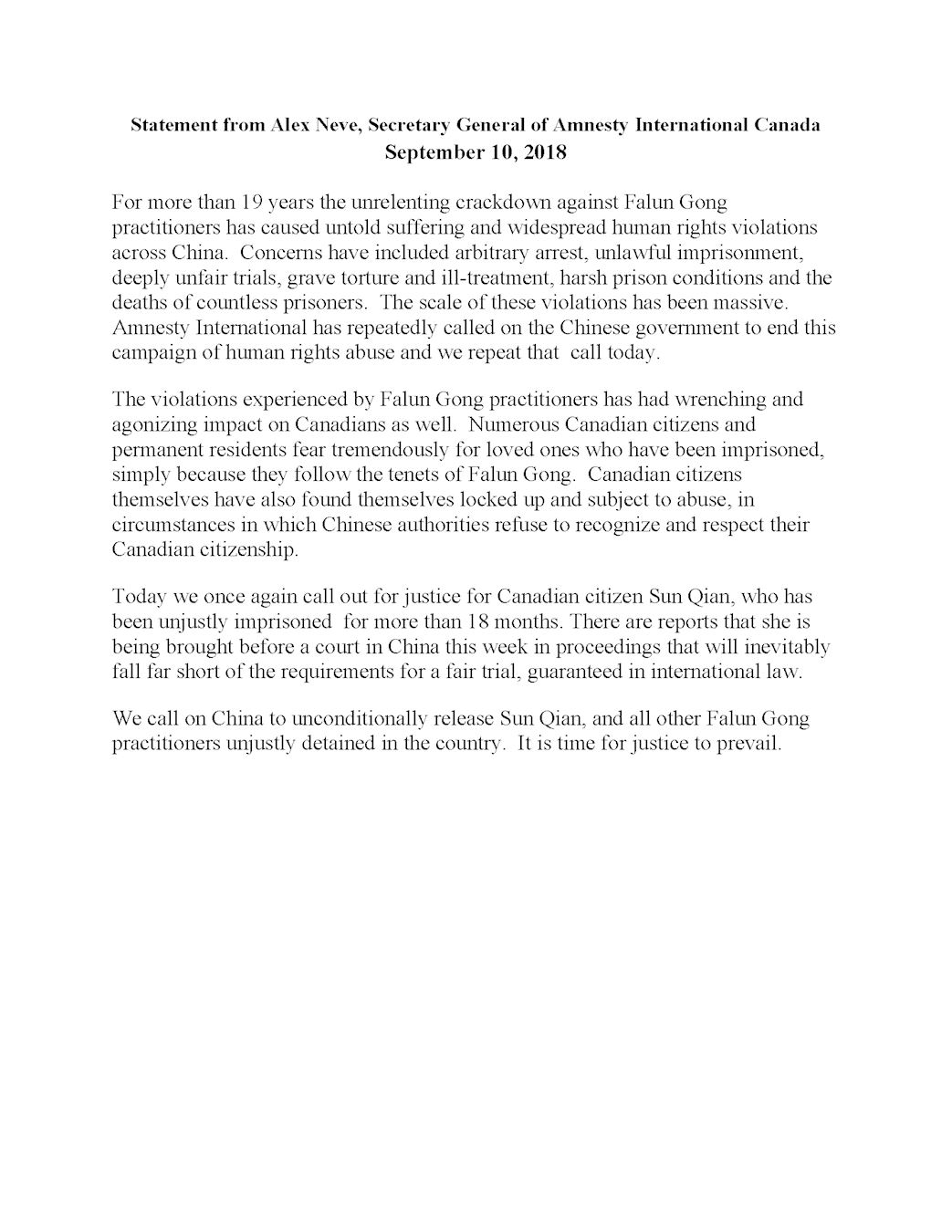大赦国际加拿大主席阿历克斯·尼夫在声明中说:“法轮功修炼者遭受的人权侵犯也对加拿大人造成了痛苦和影响。许多加拿大公民和永久居民非常担心仅仅因为遵循法轮功信仰被(非法)囚禁的亲人。“