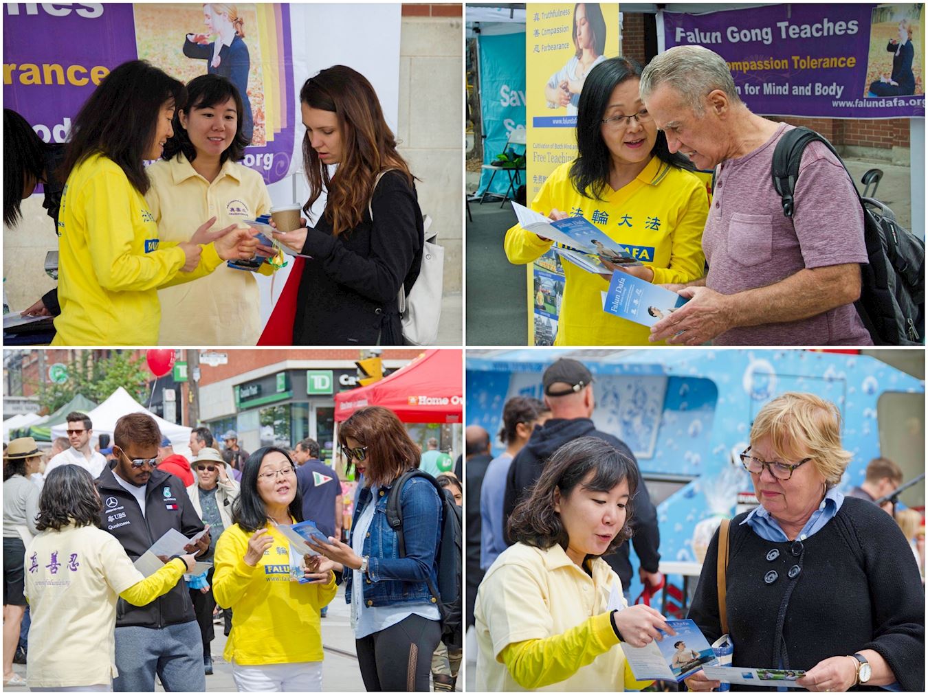 很多人来到法轮功学员的展位前询问。来自美国加州首府沙加缅度(Sacramento)的乔治(George)先生和他的朋友来多伦多旅游,在节庆上邂逅法轮功学员。法轮功学员向他们介绍法轮功去病健身有奇效,全世界有超过一亿人在炼,还告诉他们自己已炼二十六年了,受益匪浅。与乔治先生同行的一位女士很吃惊,说看学员的样子也就不到三十岁。法轮功学员告诉他们,其实自己马上就五十岁了。那位女士马上和其他人说,这就是健身效果的证据。随后他们就请学员教他们炼功。