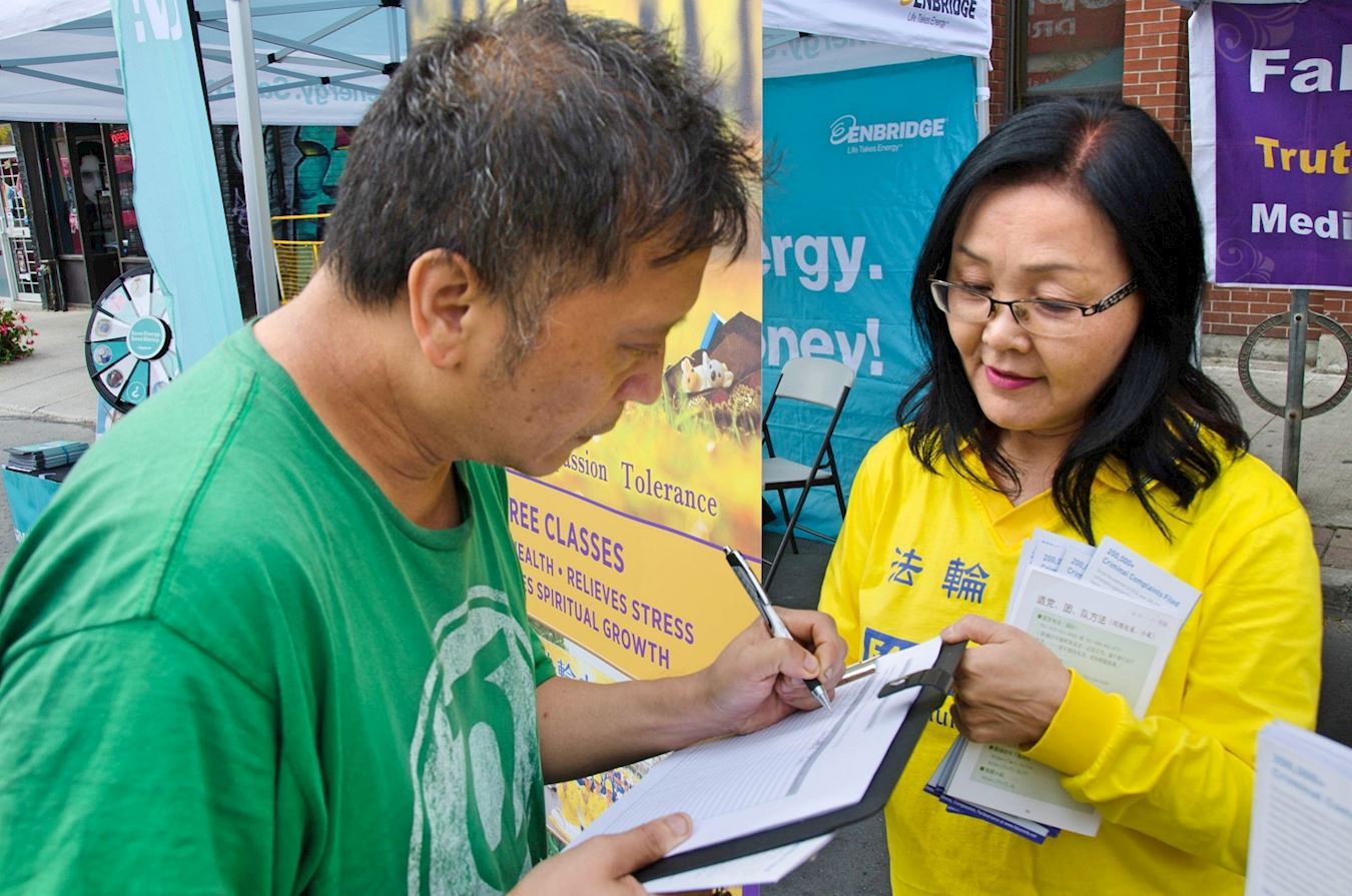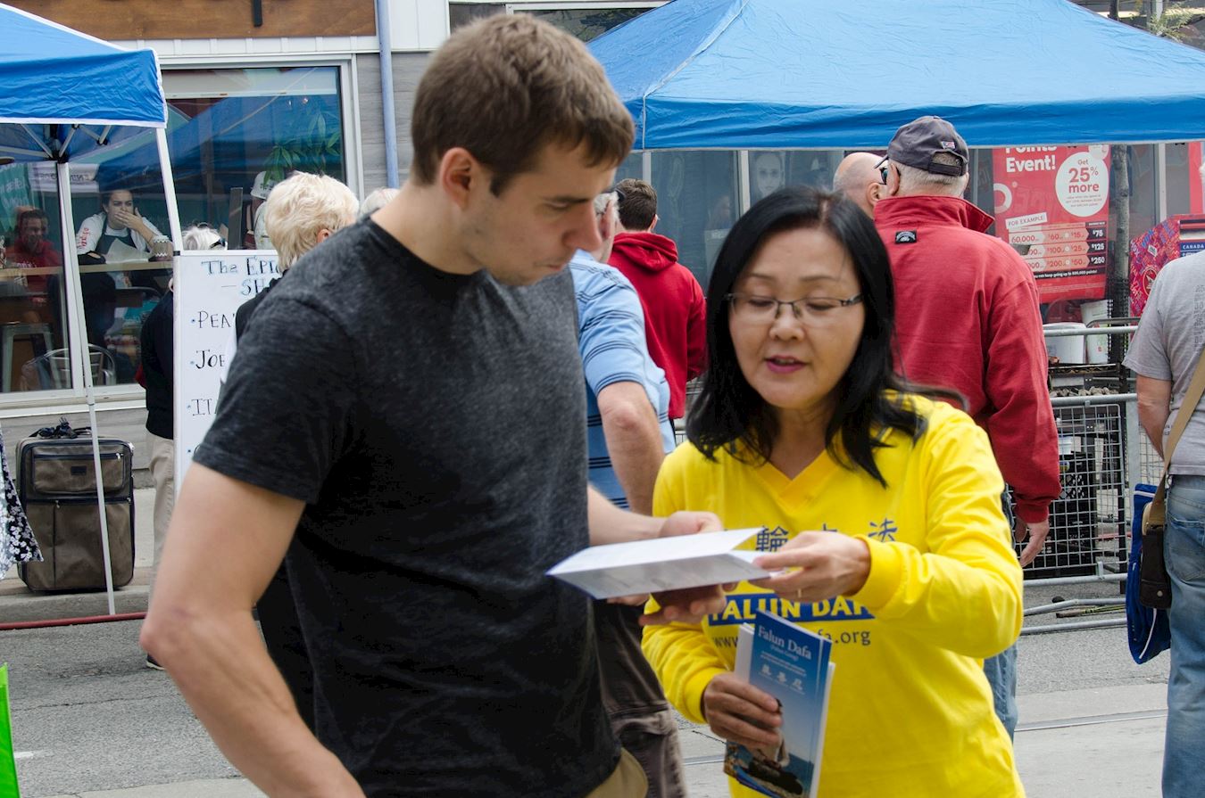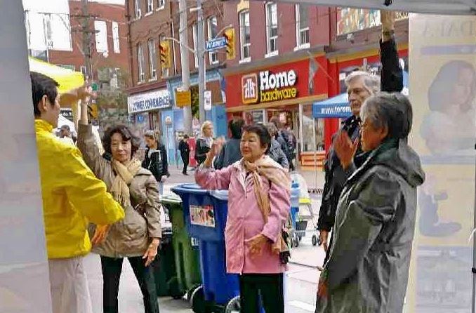 法轮功学员向艾伦(Allen)先生和他的朋友介绍法轮大法是佛家修炼方法,在全球有一百多个国家和地区都有法轮功学员在炼,而且全部资料都可以从互联网免费下载。艾伦先生表示很惊讶,问学员:“那你们拿什么挣钱哪?”学员告诉他,法轮功学员都有自己的日常工作,除去日常工作生活外还学法炼功,修炼和自己的生活没有冲突。艾伦先生留下自己的联络方式表示希望参加近期在多伦多市中心中国城天梯书店举办的九天教功班。