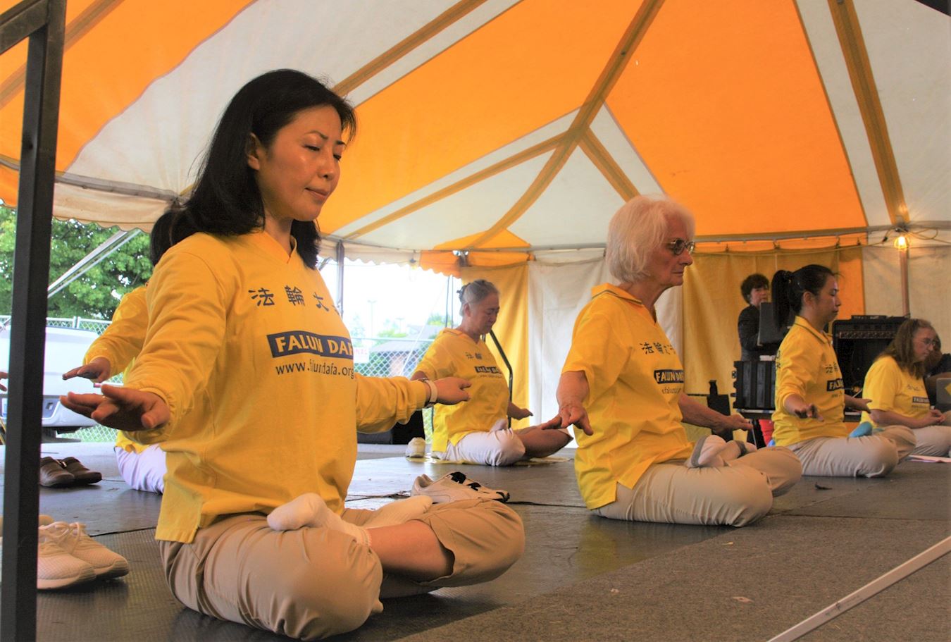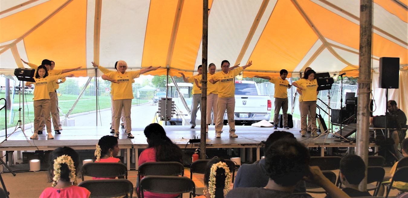 二零一八年九月十五日,部份密西根州法轮功学员应邀参加了特洛伊“国际日”(International Day)帐篷内的表演活动。随着舒缓的炼功音乐,法轮功学员在舞台上演示了五套功法,向观众介绍了什么是法轮功。