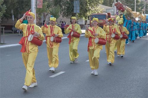 学员手持“法轮大法好”的展板,打头阵的是身着彩裙、手持扇子的仙女队,伴着“法轮大法好”的歌声沿途翩翩起舞。而后是功法展示队伍,学员们身着黄色T恤,伴随着炼功音乐向两旁的观众们展示功法动作。这时,腰鼓队响亮的鼓声也缓缓传来,不时的听到伴着腰鼓声传来的“法轮大法好!”压轴的是由学员们组成的威风凛凛的金龙,一会上下翻腾,一会接近路两旁的观众,引得观众惊喜连连,小朋友们欢呼雀跃。