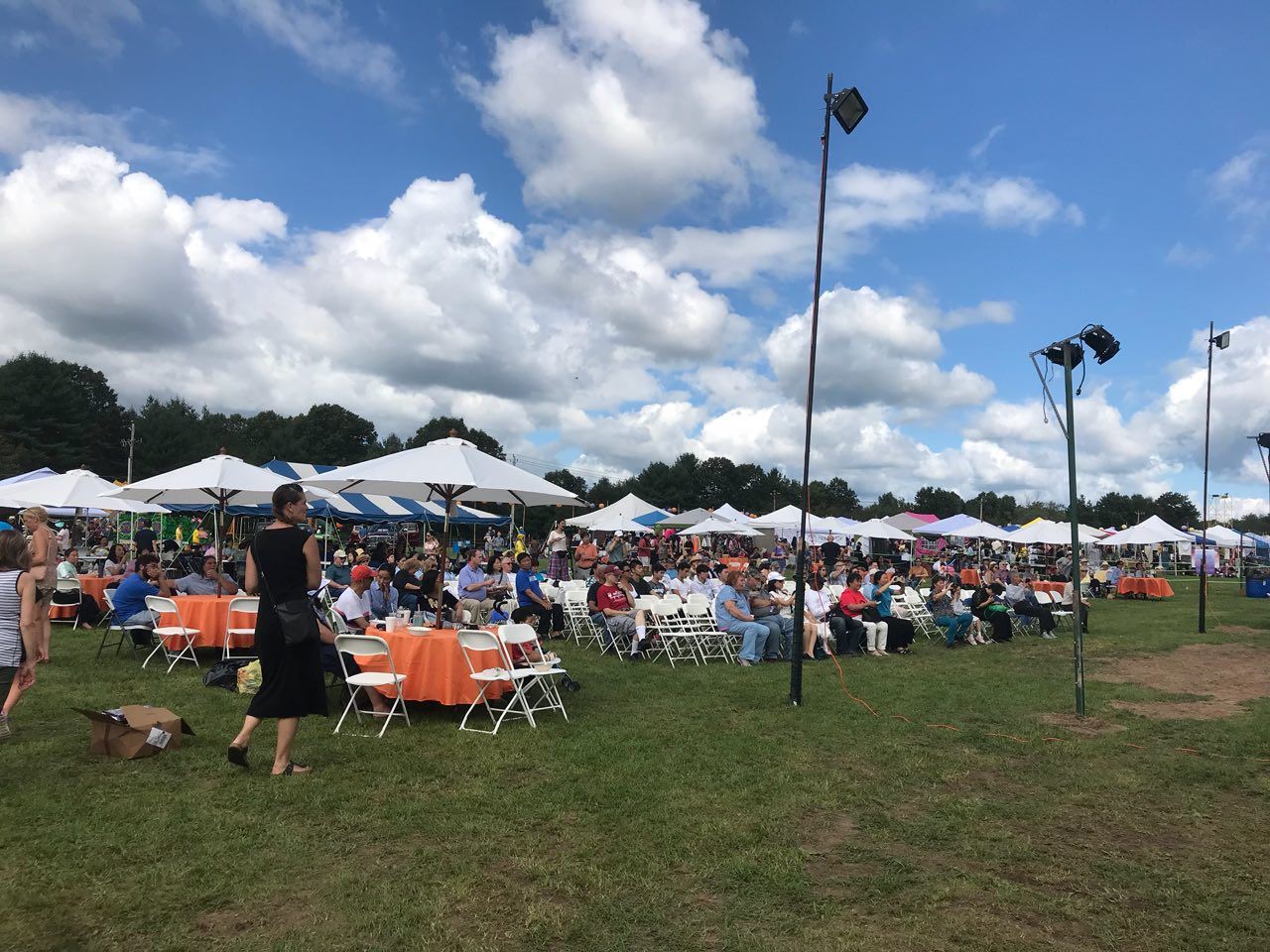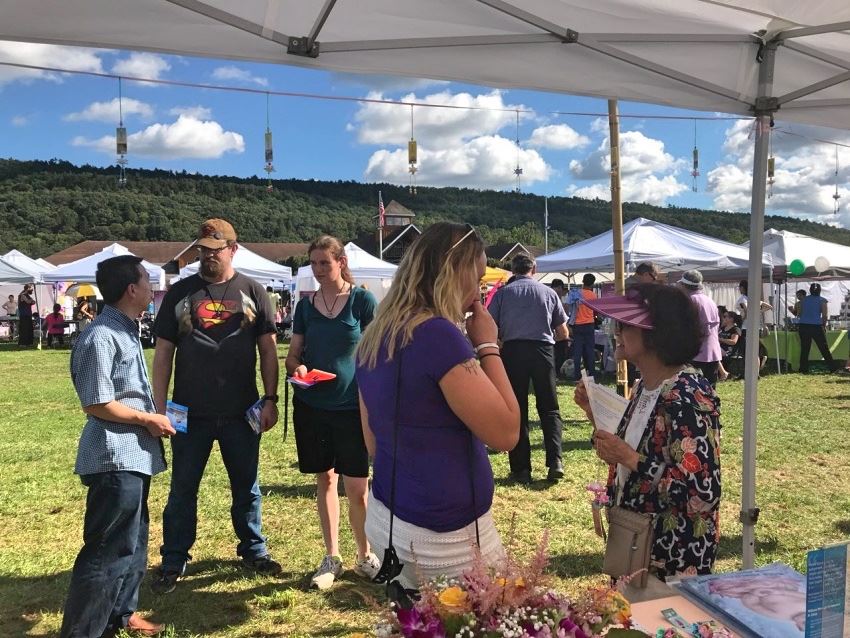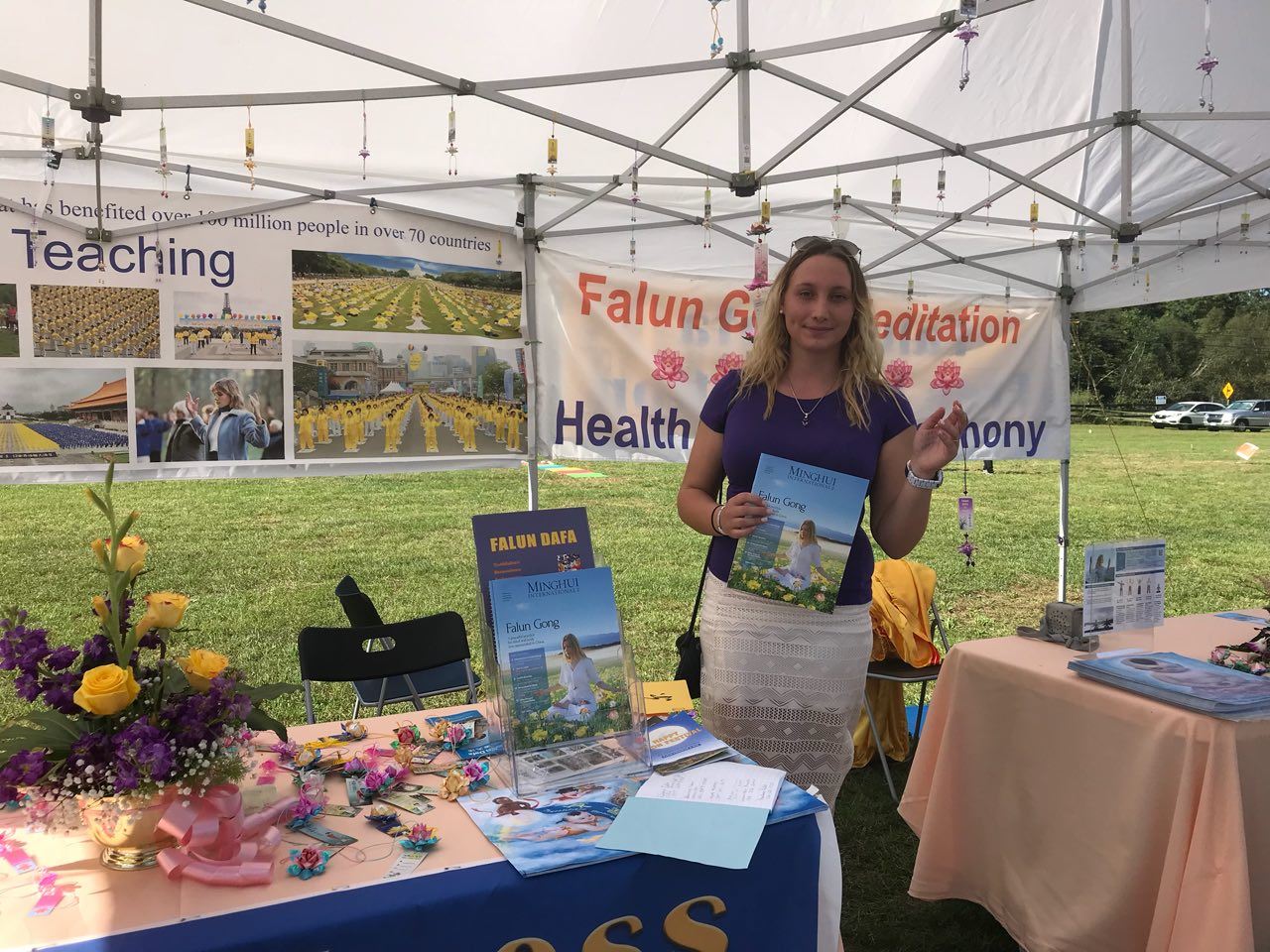 现场有几十家摊位,人来人往。悠扬的法轮功音乐,吸引着人们来到法轮功的摊位,有的接下法轮功真相传单,有的询问法轮功的情况,有的慕名而来直接要求学炼。