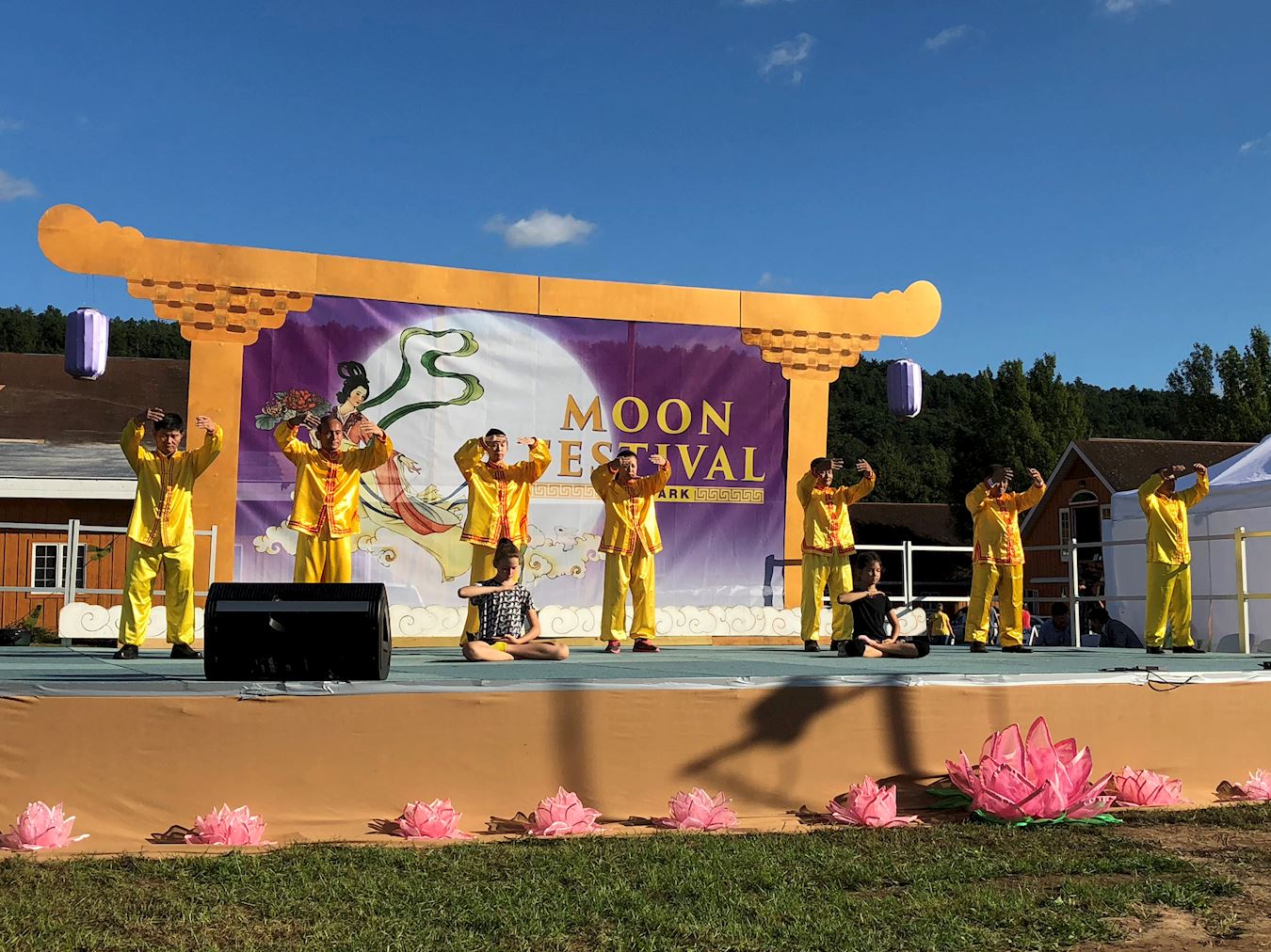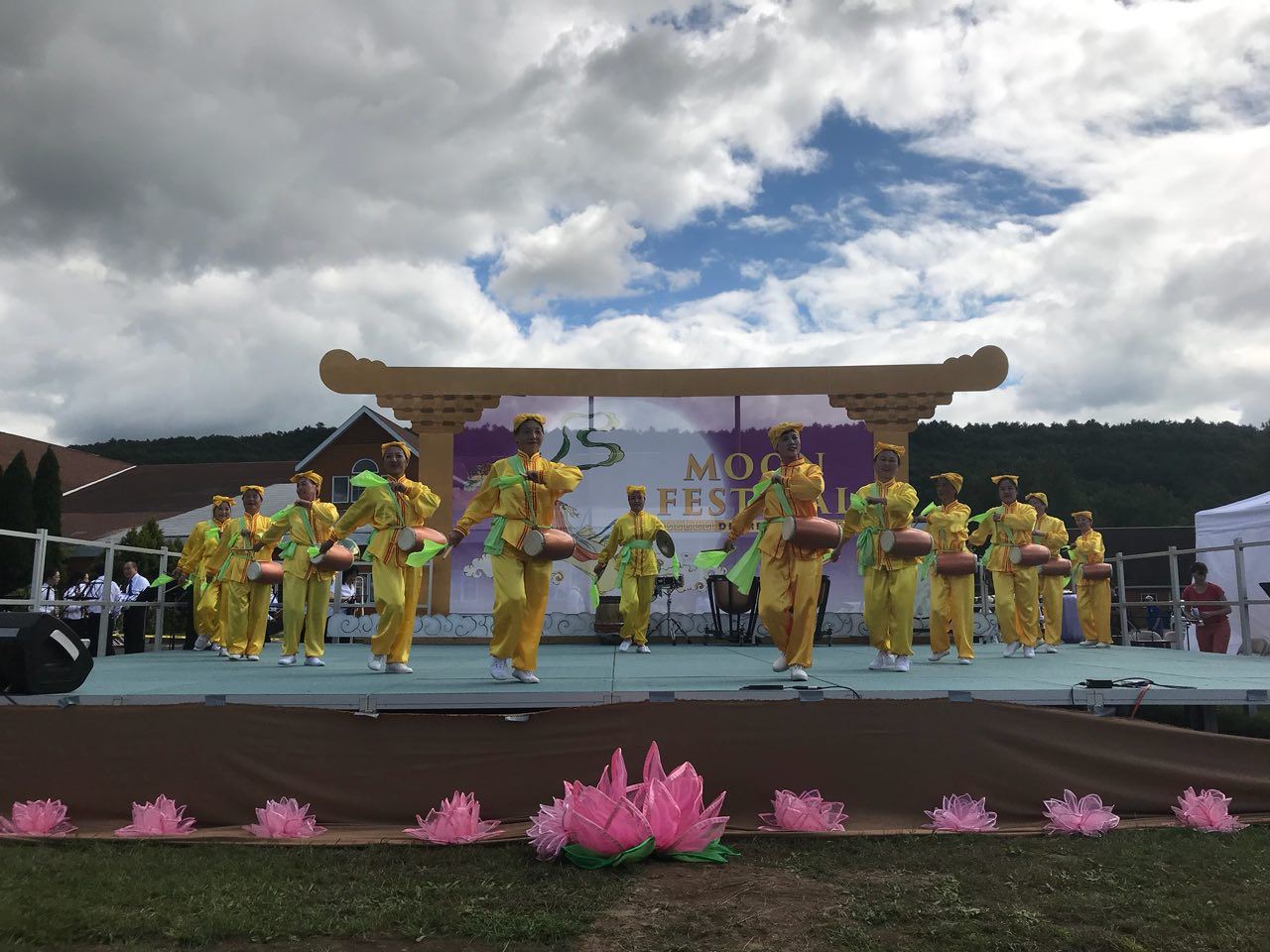 活动现场入口,各色的中式灯笼悬挂空中,祥云随伴。开阔的草坪上,长长的金龙、古色古香的大鼓烘托着一辆呈现法轮大法“真、善、忍”的亮丽的大花车。穿着中国传统仕女服装的华裔女子,提着花篮,款款穿梭于人群中,向人们献上“法轮大法好”的小莲花吊坠。