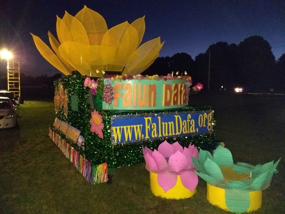 ![]() 图7:夜幕降临,草坪上的有“法轮大法”字样的花车。 |