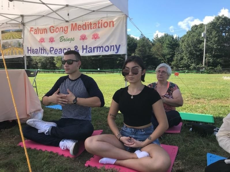 青年西人约翰(John)和女友伽罗(Kiara)在现场学炼法轮功功法,他们学了几遍静功,约翰说:“感觉很好,很放松、很美妙。”伽罗虔诚地表达自己对这门功法的尊敬,她一直想炼法轮功。