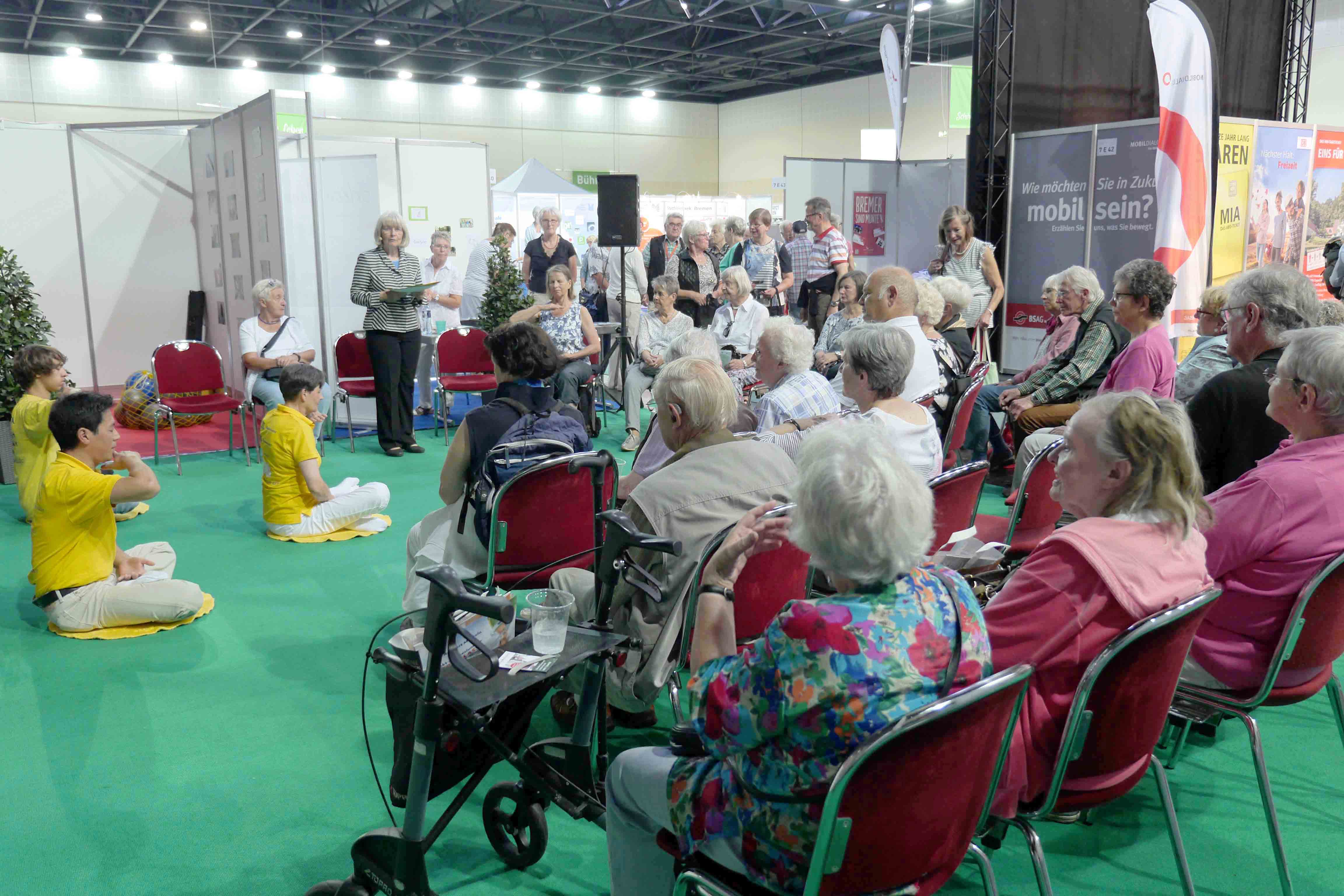 健康展上节目丰富,各类适合老年人的体育锻炼、旅游项目、户外活动、疗养进修娱乐等等,应有尽有。法轮功学员的展位设在第七展厅,展桌上的屏幕放映着“什么是法轮大法”的介绍短片,同时由几位学员演示一到五套功法。法轮功缓、慢、圆的动作和功法解说吸引不少访客坐下,细细观看。