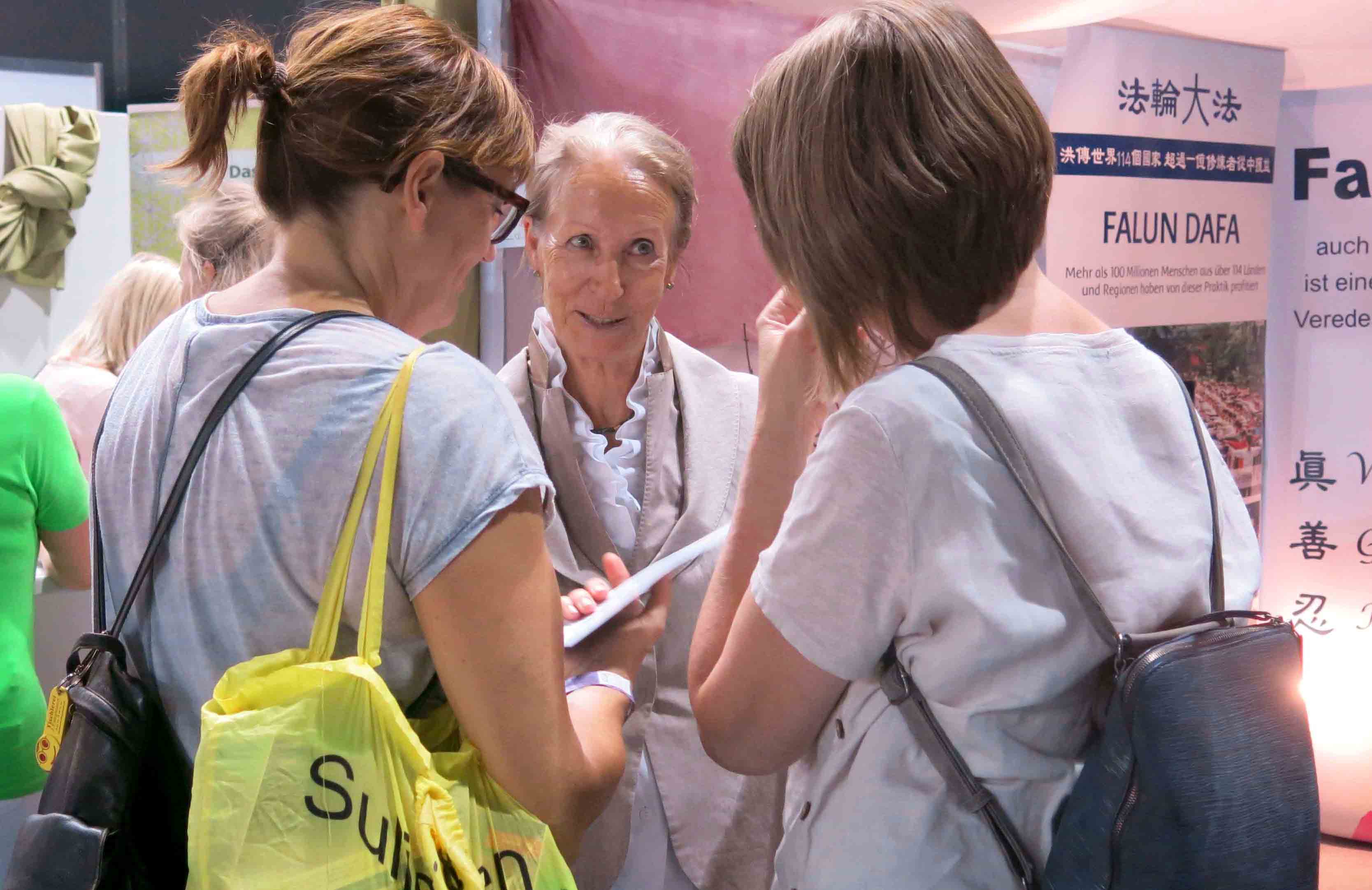 展会工作人员特地到展位上来和学员聊天,她说,法轮功的展位吸引了许多访客,她感到很高兴。