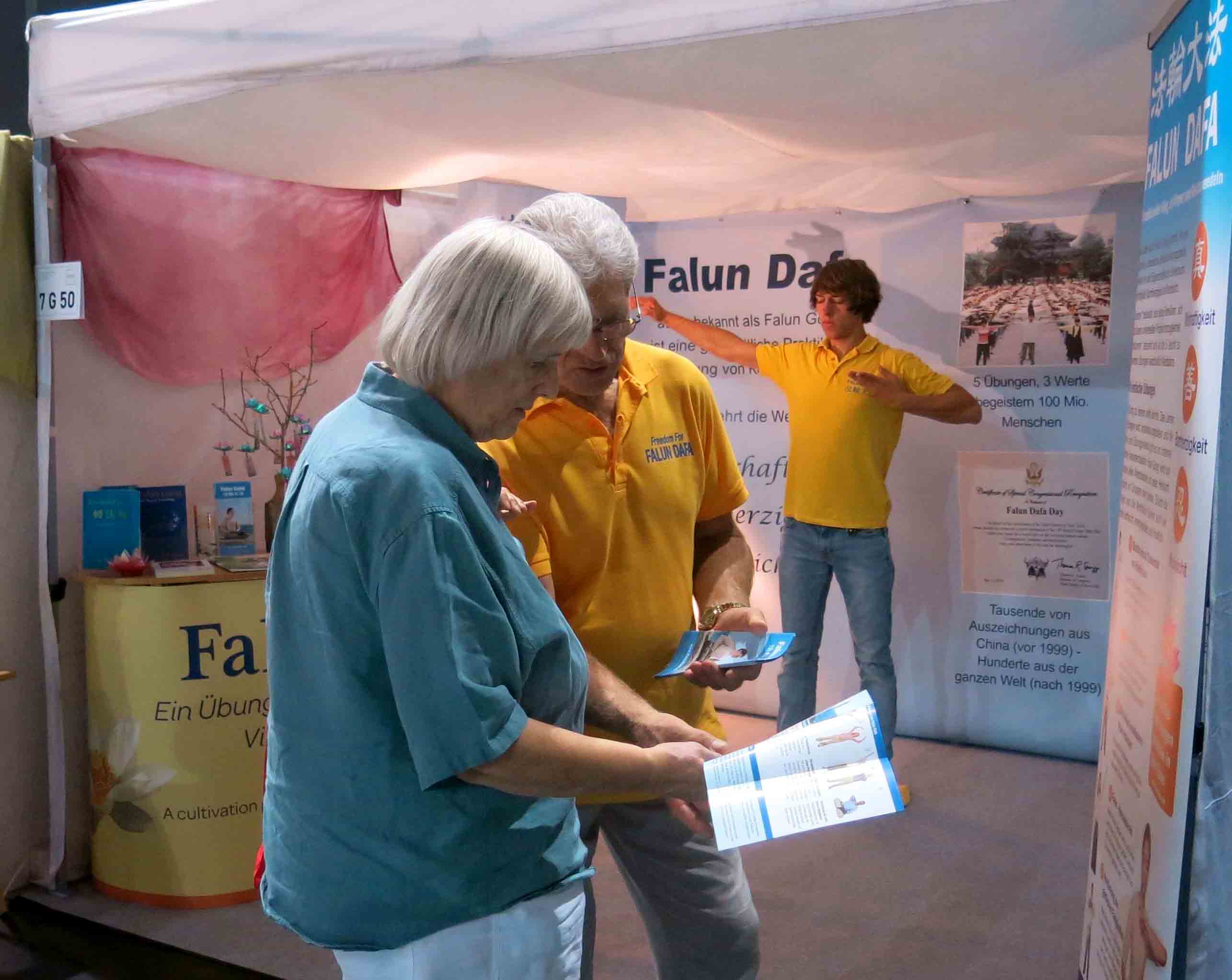 一个年轻女子经过展位时,不由“哇“地惊叹,她解释说自己惊叹这里宁静祥和的氛围,非常与众不同。她很喜欢法轮功学员的展位,表示无论如何要去当地的炼功点学功。