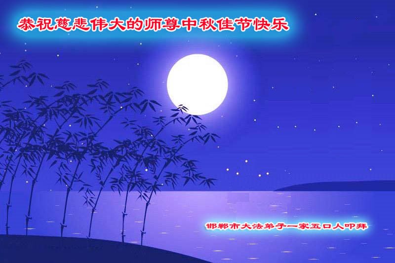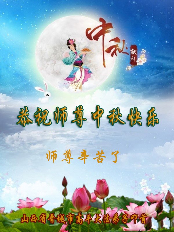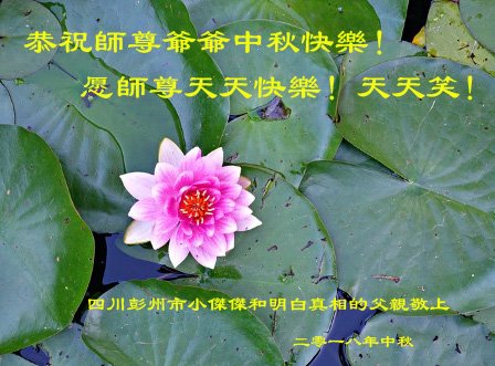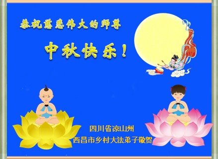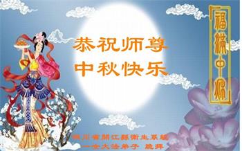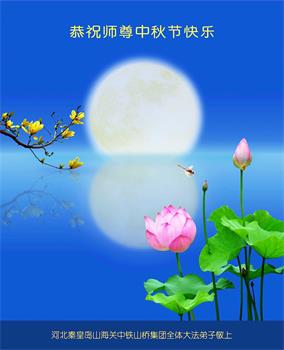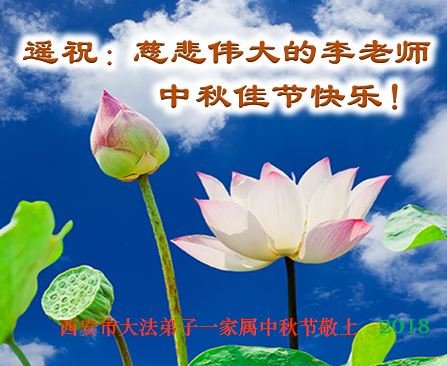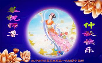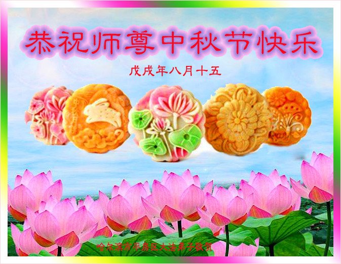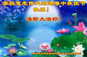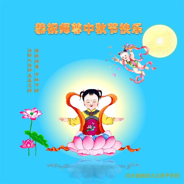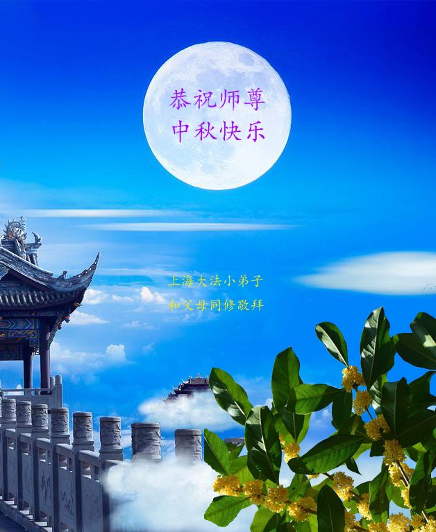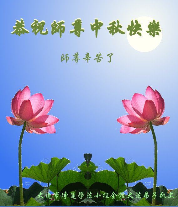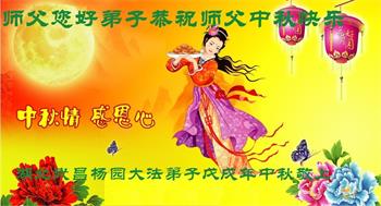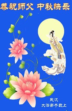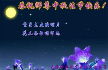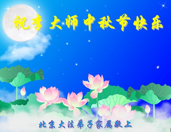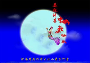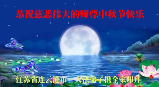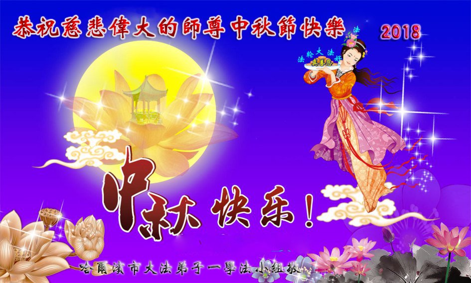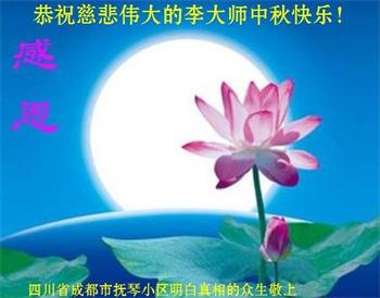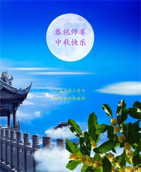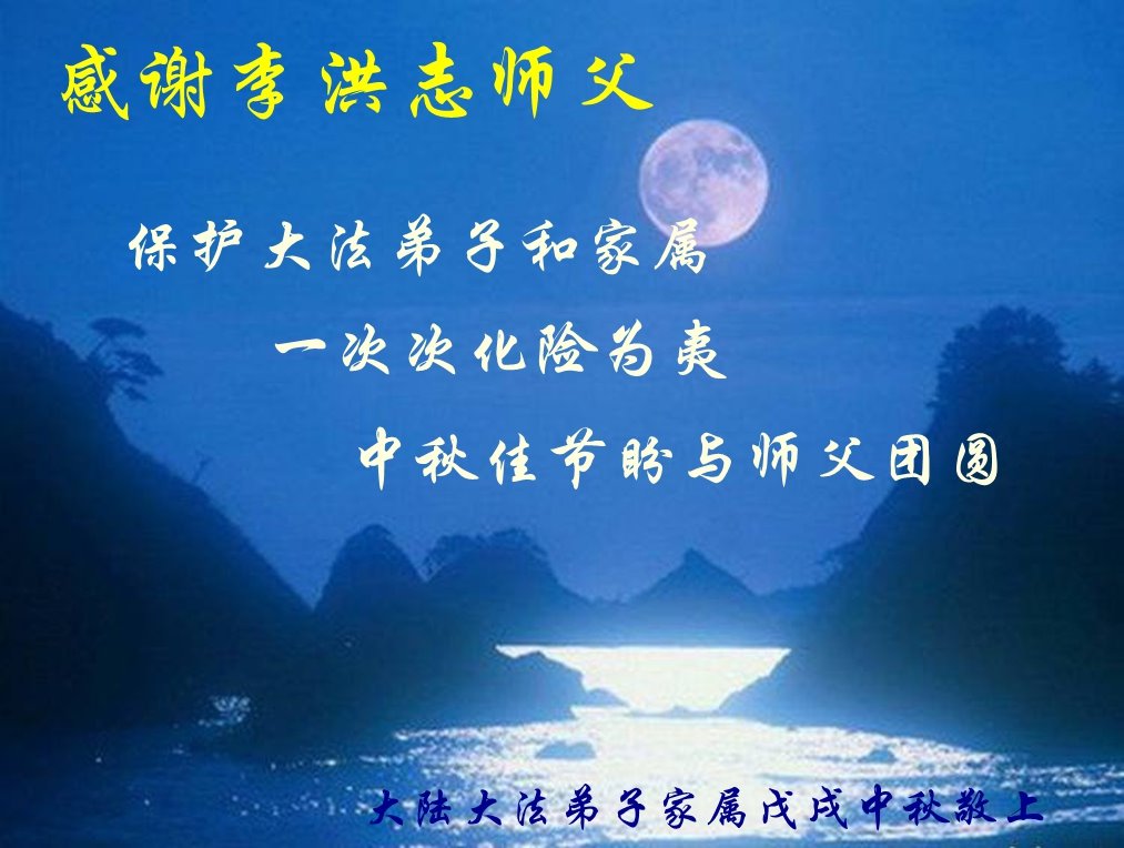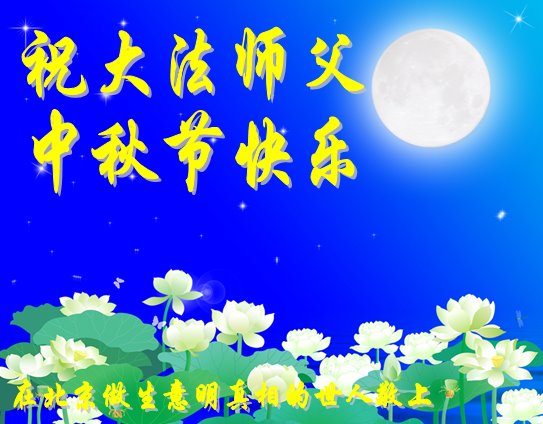 每年的八月十五,是我们中国人民传统的中秋佳节,菊桂飘香,万家灯火,皓月当空千万里,值此之际,借明月遥寄我们全家人诚挚的祝愿:恭贺大师中秋节快乐!祝您的家人及您所有的弟子中秋节快乐!大师佛恩浩荡,感谢您的慈悲救度,我们都是大法的受益者,期盼大师早日荣归故里,您是全人类的希望!再次恭贺大师中秋节快乐!