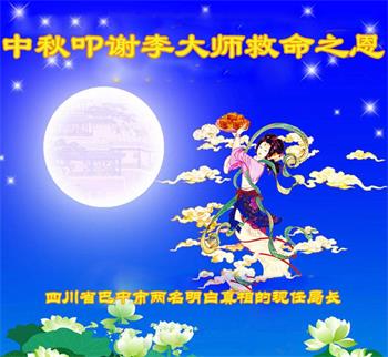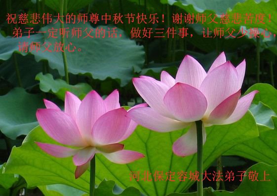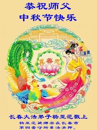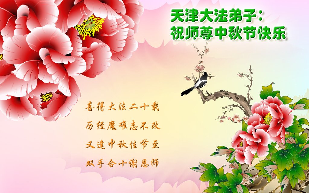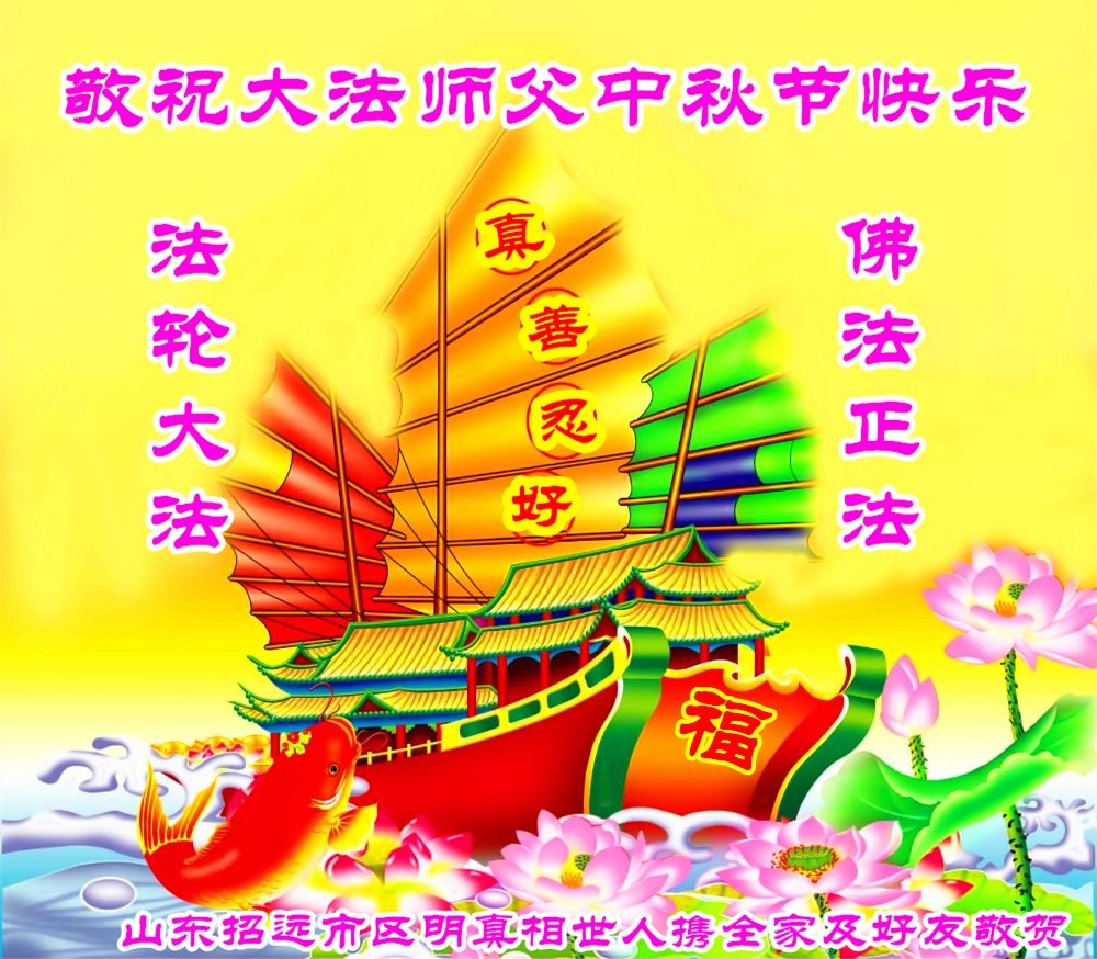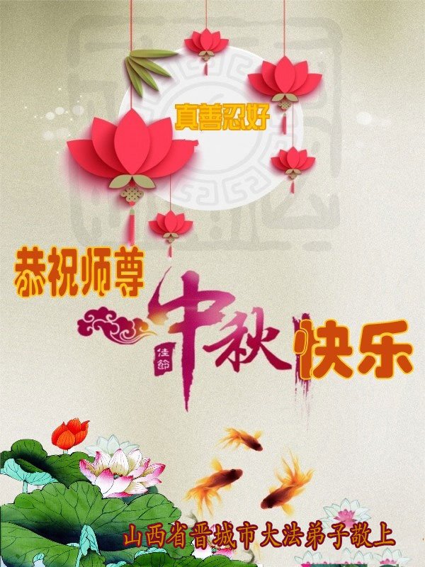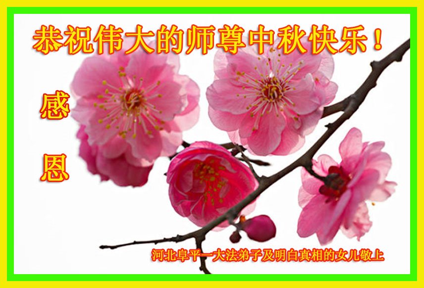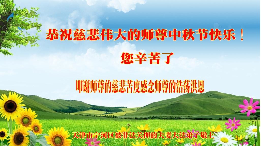 我原是某单位的一名处级干部,看不惯共产邪*党-腐败的乱象,常常感到人生迷茫。突然有一天接到了一本明慧期刊读物。原来睡眠不好,每天都靠吃安眠药睡眠。明白真相后,我就天天念:法轮大法好!真善忍好!每天睡觉之前我就一遍一遍的念这九个字,一直念到把脑子装满,就睡着了。是法轮大法让我看到了生命的希望。在中秋到来之际,我们夫妇非常感谢您!谢谢李大师!恭祝慈悲伟大的李大师中秋快乐!
