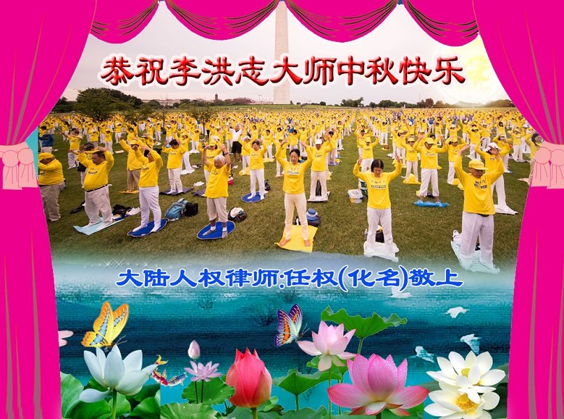 “海上升明月,天涯共此时”。大法洪传,中秋感怀。作为一名大陆律师,请允许我乘天空的彩云,向远在大洋彼岸的法轮大法创始人李洪志先生,送上诚挚的中秋祝福!