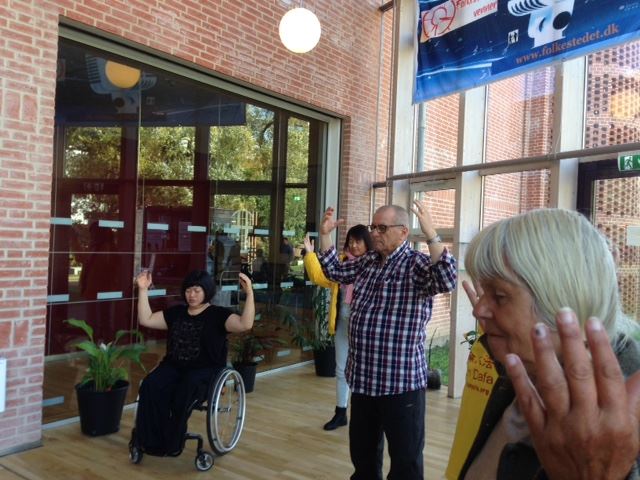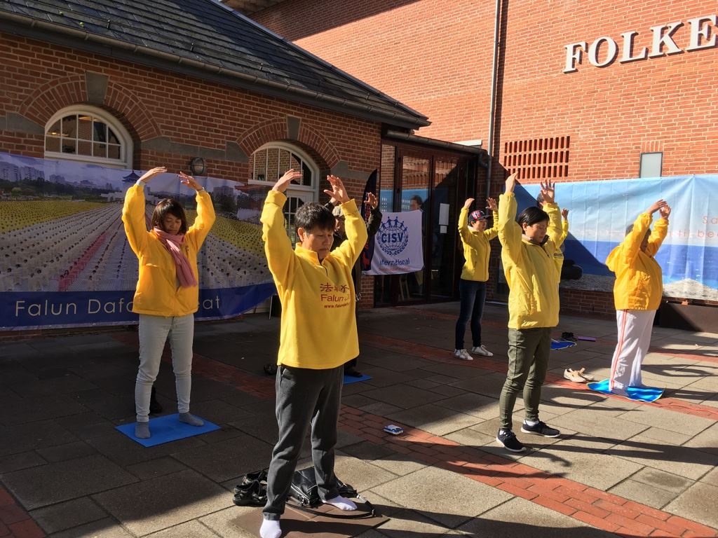 ![]() 图1:丹麦法轮功学员在“欧洲志愿者之都”(European Voluntary Capital Aarhus)活动中展示五套功法。 |