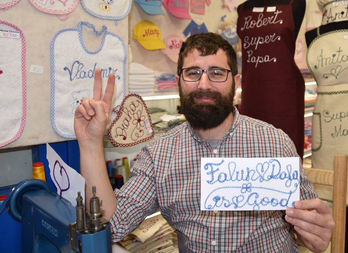 尼古拉·桑太拉尼(Nicola Santellani)先生的工作是在老城区製作和出售机绣艺术品给游客,当他看到游行队伍时很高兴,他主动招呼法轮功学员,并在一张纸上很快绣出“法轮大法好”的英文作品,并送给法轮功学员。
