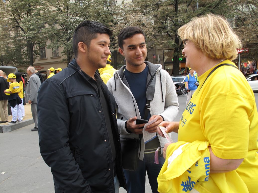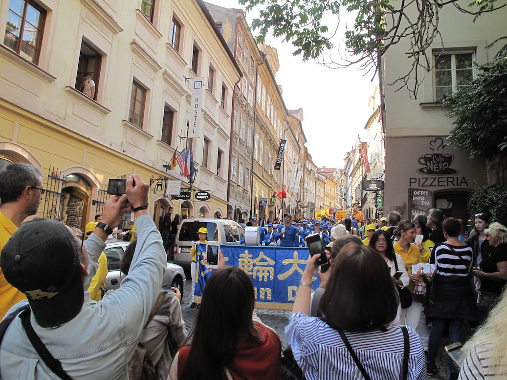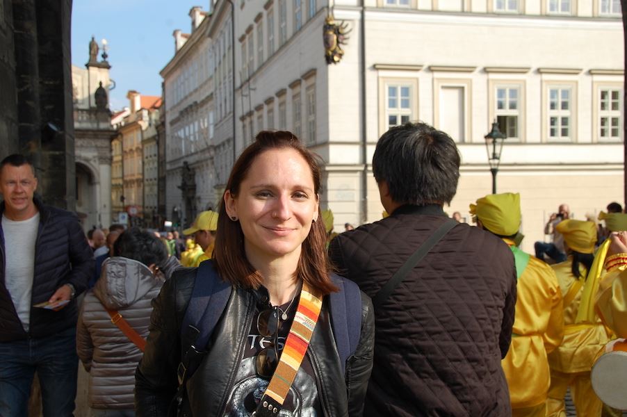 在城堡中一家工艺品商店的纳迪亚(Nadia)饶有兴致地站在门口用手机对着游行队伍录像。纳迪亚对法轮功并不陌生,她曾多次在布拉格市中心看到法轮功学员举办信息日。在那里她了解到法轮功能使人快乐健康,也了解到在中国的法轮功修炼人因为对真、善、忍的信仰被中共政权迫害,许多修炼人被迫害致死。年轻的纳迪亚没有经历过共产统治,她无法理解为什么一个政府要迫害无辜的人:“每一个人都应该可以自己决定要做什么,这是很自然的事情。”“我不明白中共政府为什么要迫害,修炼法轮功能让人感到快乐,这不是一件好事吗?”