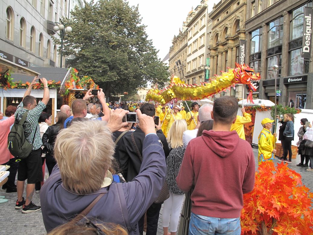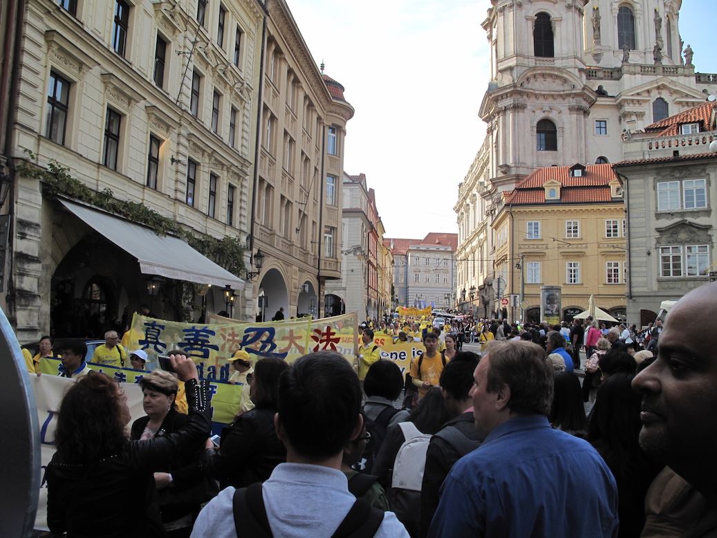 在法轮功游行队伍在布拉格古城穿过时,有很多中国人驻足观看拍照录像,有人立即用手机把信息分享出去,有的在说,“哇,(法轮功)队伍这么长。”