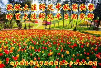 山东省威海荣成市一大法弟子家人祝李大师中秋节快乐!他在贺词中写到:尊敬的李大师好!每年的八月十五,是我们中国人民的传统佳节,菊桂飘香,万家灯火,皓月当空,值此之际,借明月遥寄我们全家人诚挚的祝愿:恭贺大师中秋节快乐!祝您的家人及您所有的弟子中秋节快乐!大师佛恩浩荡,我们都是大法的受益者,感谢您的慈悲救度。期盼大师早日荣归故里,您是全人类的希望!
