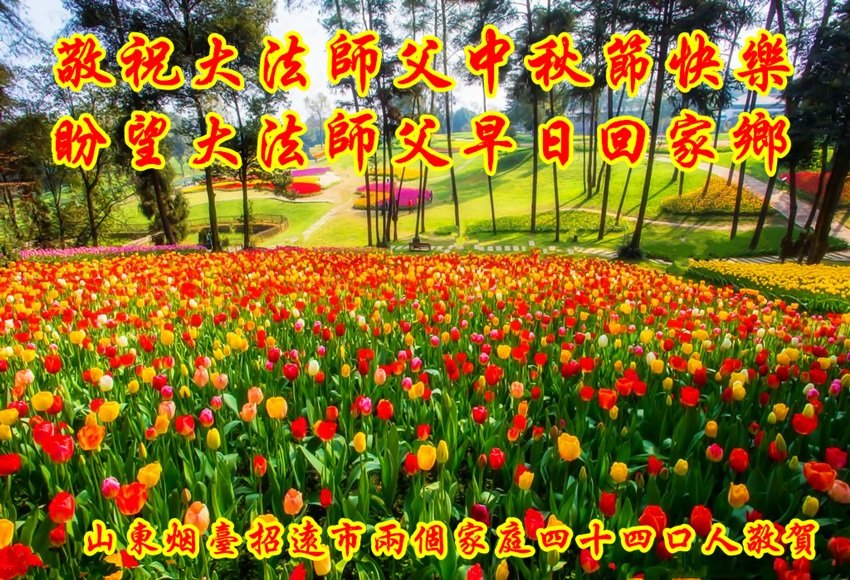 山东烟台招远市两个家庭四十四口人恭祝大法师父中秋节快乐!他们在贺词中说:中共打压法轮大法近二十年,我们亲眼见证了大法的超常和了不起,见证了中国大陆大法弟子的和平理性、坚忍不拔的高贵品质,邪不压正!中共邪*-整人、害人,假、恶、斗的邪恶本质和犯下的滔天大罪早已失去人心。法轮大法是正法,不仅祛病健身有奇效,大法能归正人心,从根本上改变人。尽管现在邪*-还没有停止对法轮大法的迫害,那也不过是灭亡前的垂死挣扎,是回光返照!法轮大法在中国和世界洪传,将对人类道德的升华,传统的回归起到巨大的推进作用。从大法弟子的身上我们看到了中国未来的希望。