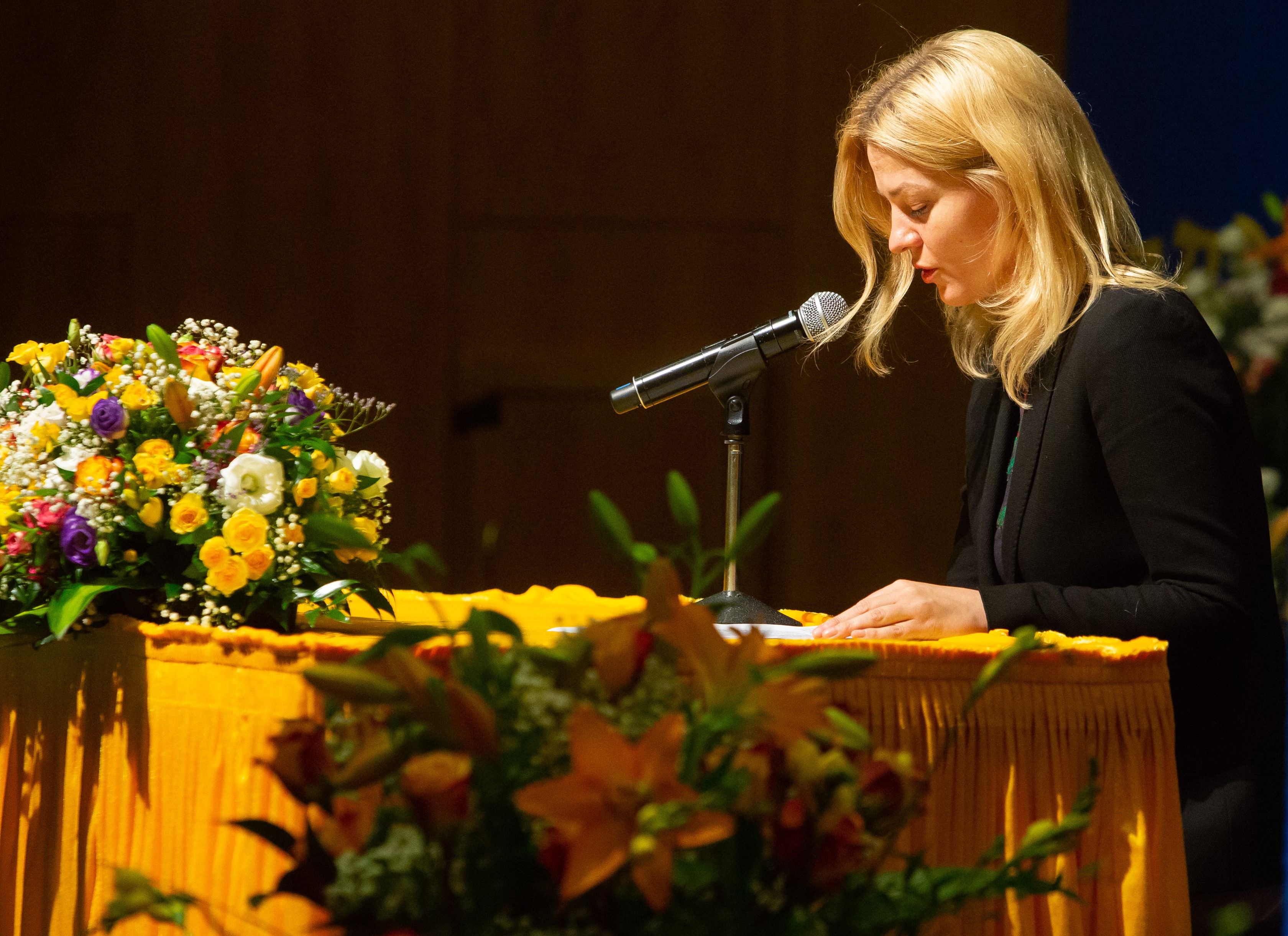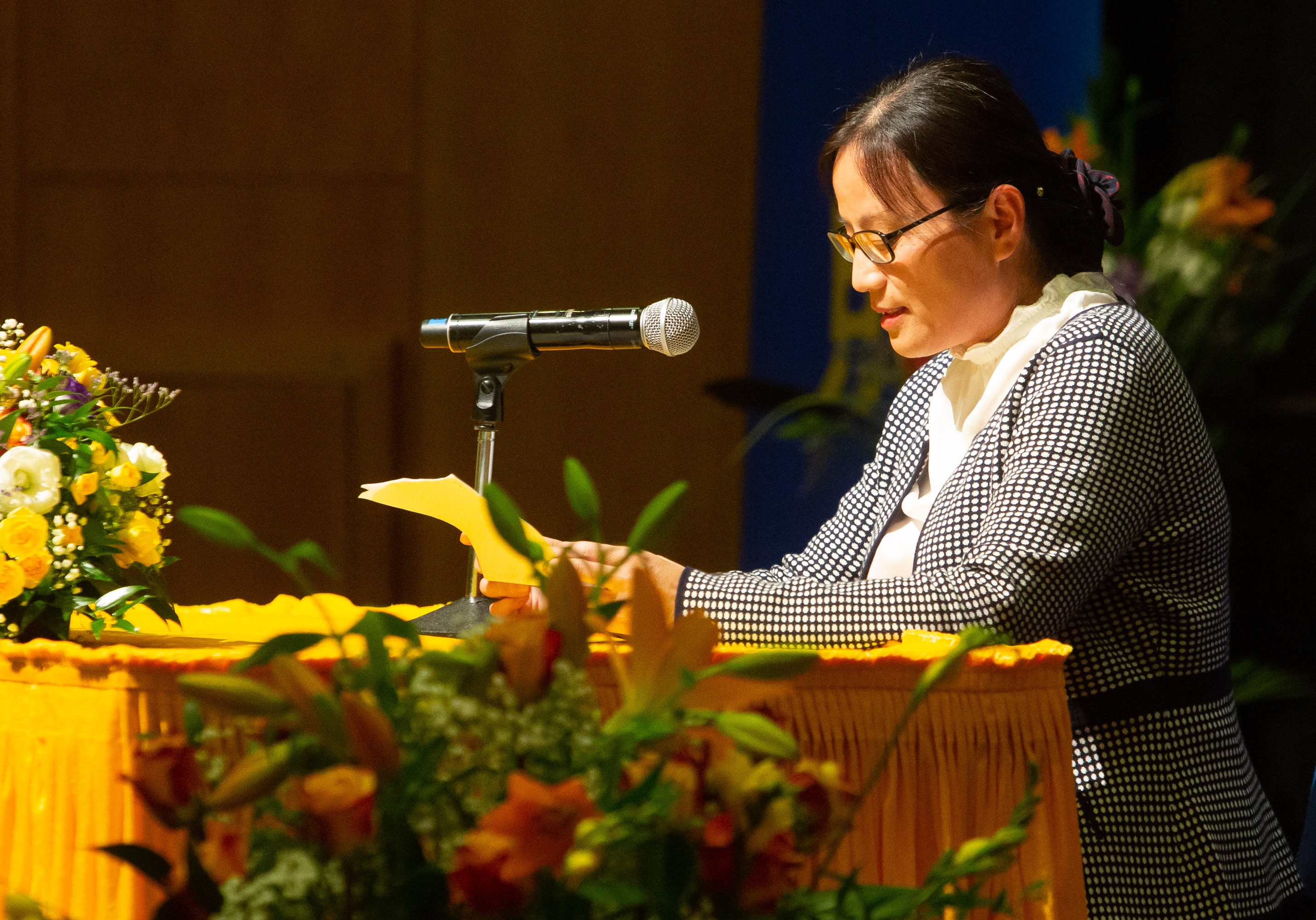 桔色的鲜花点缀着法会主席台,两侧悬挂着“佛光普照,礼义圆明”的条幅。来自捷克、英国、瑞典、挪威、德国、拉特维亚、奥地利、法国、希腊、瑞士、黑山、比利时和塞浦路斯的二十位法轮功学员分享了他们的修炼体会。法会提供了十三种语言的同声翻译,与会者在祥和的氛围中聆听每一位发言者的交流。