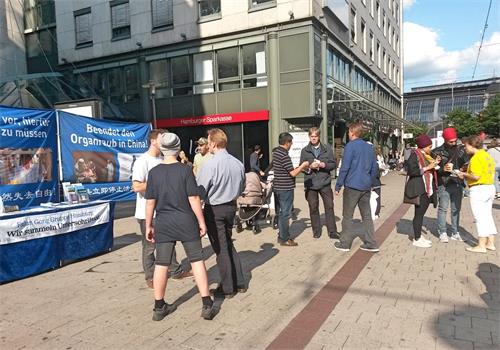 在学员的努力下,许多过往行人明白了法轮功是以真、善、忍为指导的性命双修的功法,也了解到中共为什么要强摘法轮功学员器官,并签署了反对迫害的请愿书。