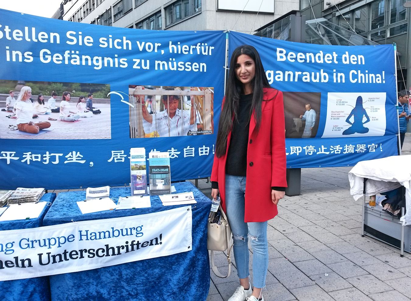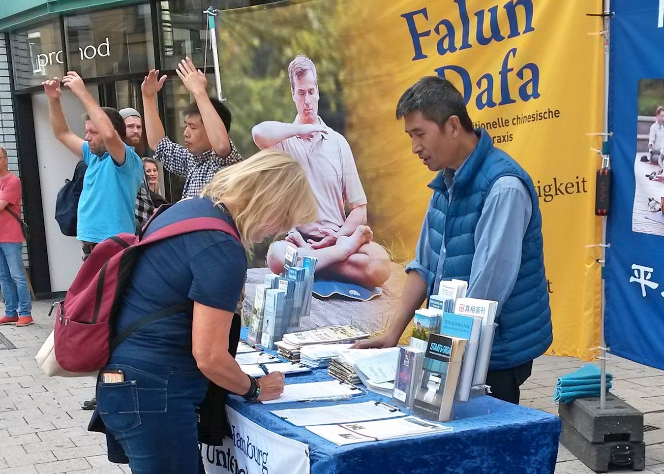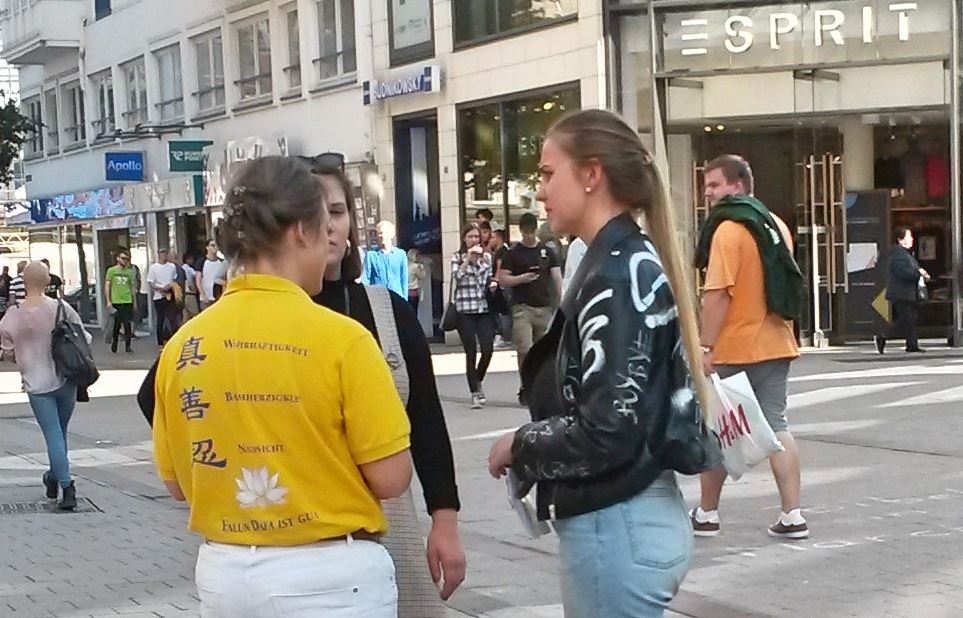 德莉亚(Deria Schleweis)直接来到桌子旁签署请愿书。她告诉一位学员她大学的毕业论文主题是贩卖人口,所以被展位的主题所吸引。这位年轻女士说,“在德国只要你不伤害其他人,就可以自由的发展自我。人的尊严应该是不可侵犯的。这就是为什么我一定要签名。即使(为停止迫害)只贡献了一点我也有一种很好的感觉。谢谢您提供的信息,祝你们成功!”