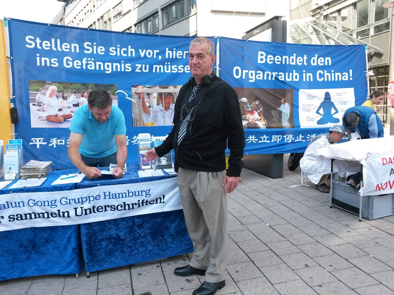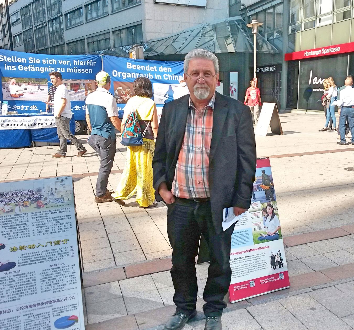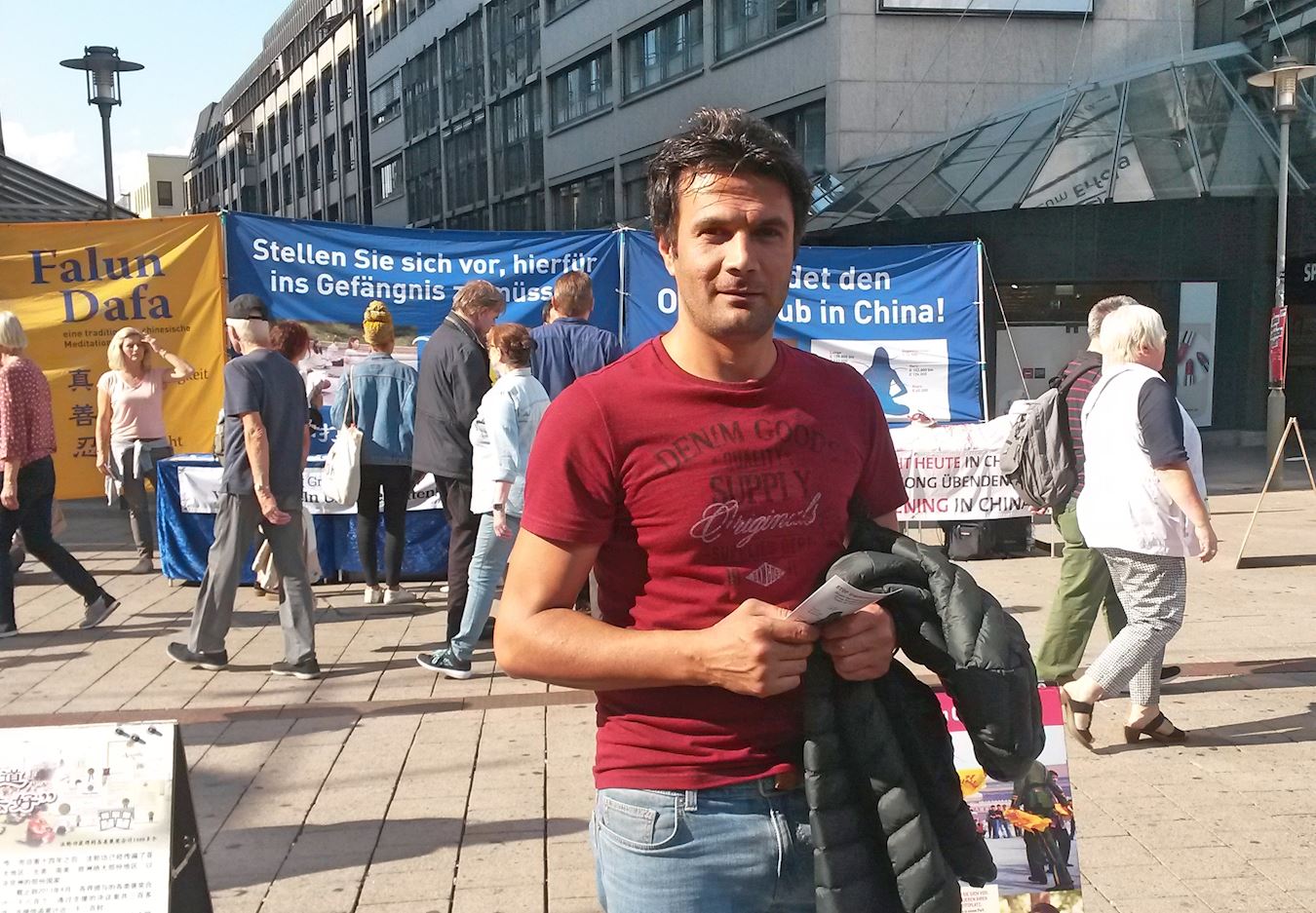 来自德国克林格胡森镇(Kellinghusen)的索雷马尼先生(Abtin Soleimani)因为对功法本身很有兴趣而走近展位,他很高兴得知法轮功是免费传功、自由学炼,而且对身心放松和减轻压力也很有帮助。