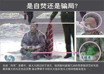 以被称为“世纪谎言”的“天安门自焚”伪案为例。二零零一年一月二十三日,中共为挑动民众仇恨法轮功,特意在天安门广场上演了一出自焚的闹剧。事后证明,这起自焚完全是一场骗局。单就第一个点火自焚的王进东来讲,中共殃视播放的镜头显示,王进东的棉衣裤子都被烧烂了,可他的头发却完好。两腿间盛汽油的塑料雪碧瓶在大火中也丝毫没有变形。