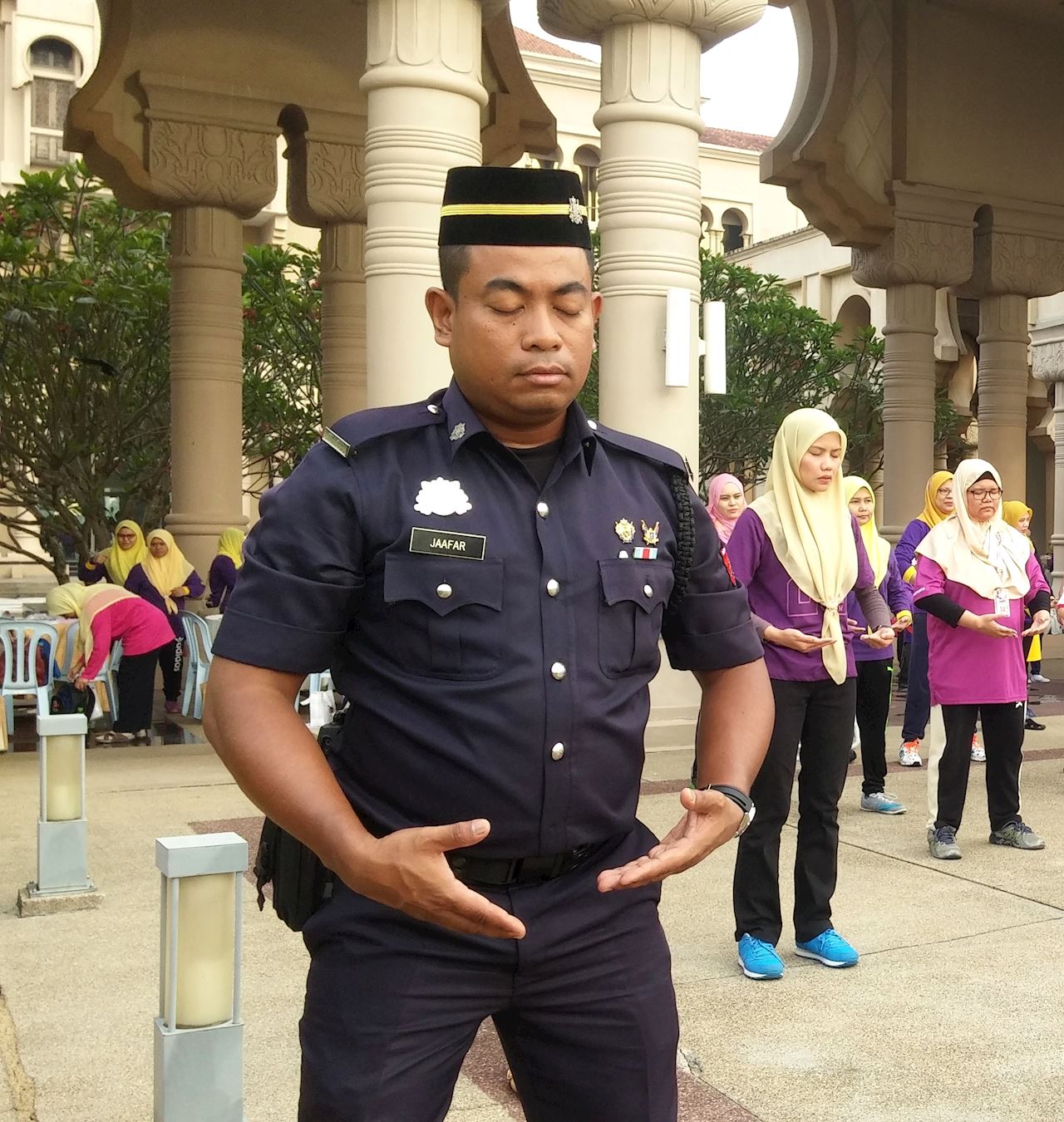 ![]() 图6:柔佛州政府秘书办公室保安Jaafar先生(左一)专心的学炼法轮功。 |