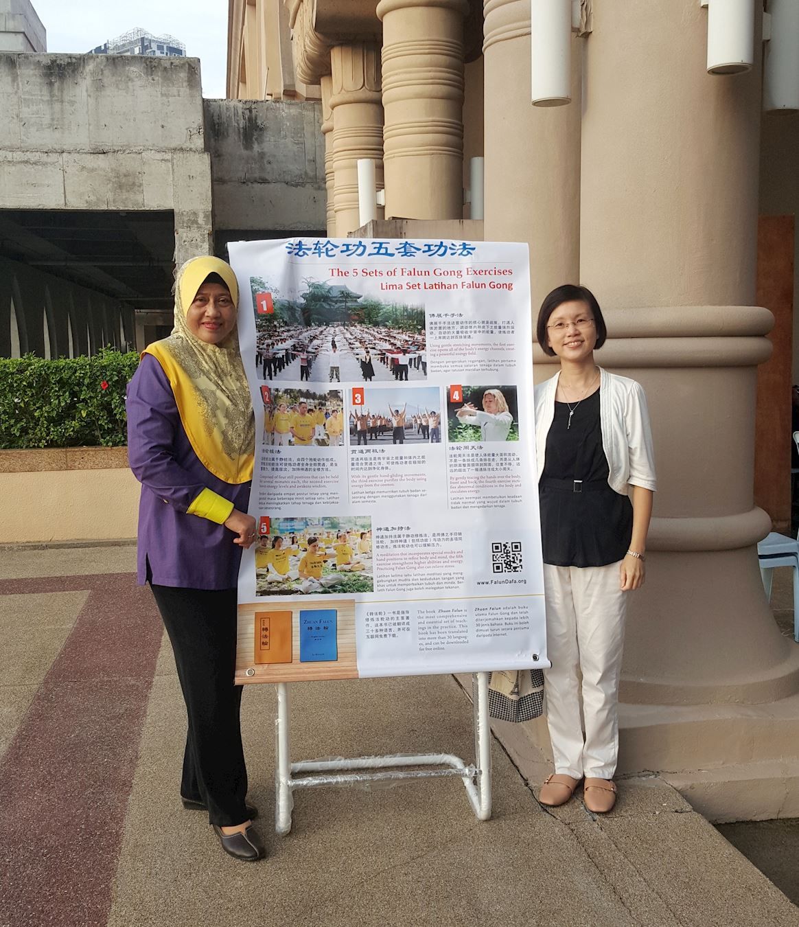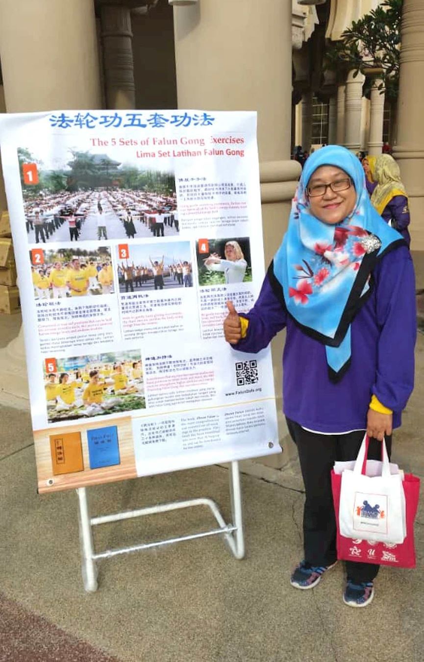 来自柔佛州巴西古当苏丹依布拉欣理工学院(Politeknik Ibrahim Sultan, Pasir Gudang)今年44岁的Azlinda女士,由于抵达现场较迟,在大家学炼第四套功法时才参与进来炼。她分享道,这是一项很好的健康活动,虽然只炼了几分钟,但她已感觉有些能量,觉得非常好,并要求在“法轮大法”横幅前拍照留念。她也表示会浏览法轮大法网站,希望能了解更多。