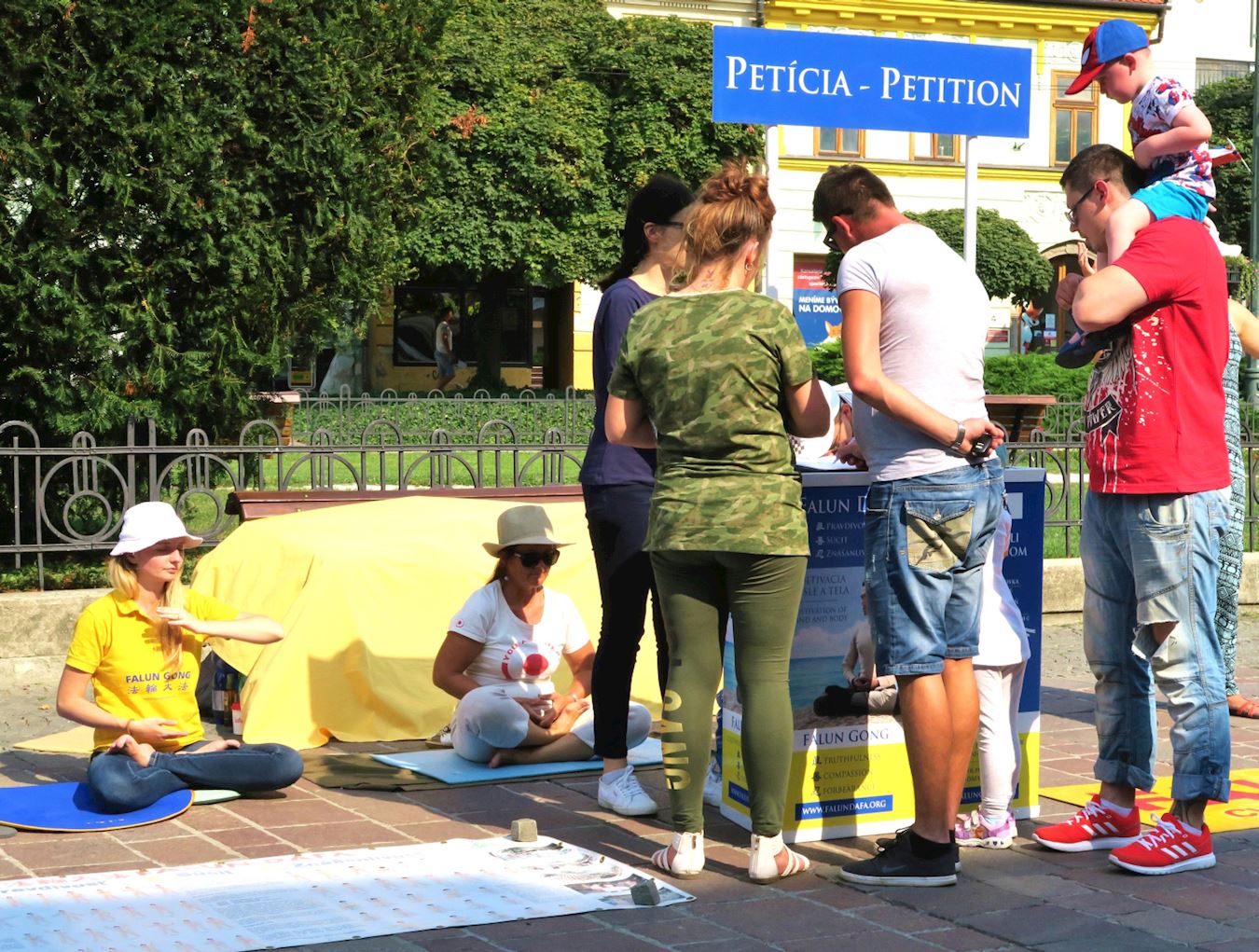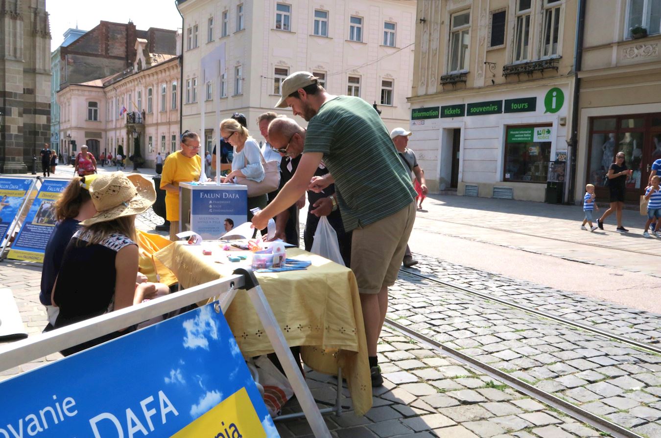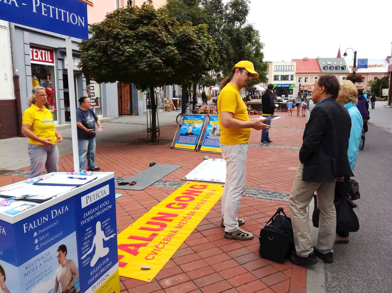 在利普托斯基·米库拉什市(Liptovsky Mikulas),许多人围着法轮功学员的征签台听真相。一位女士了解到中共活摘法轮功学员器官的罪行后非常震惊。她在征签簿上签名后说:“现在世界上有许多恐怖的事件发生。你们做的很好。请继续做下去。”