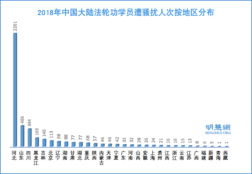 骚扰迫害最严重地区:河北2201人、山东406人、四川344人、黑龙江169人、吉林140人、北京113人、辽宁98人、湖南88人、甘肃77人、湖北77人。