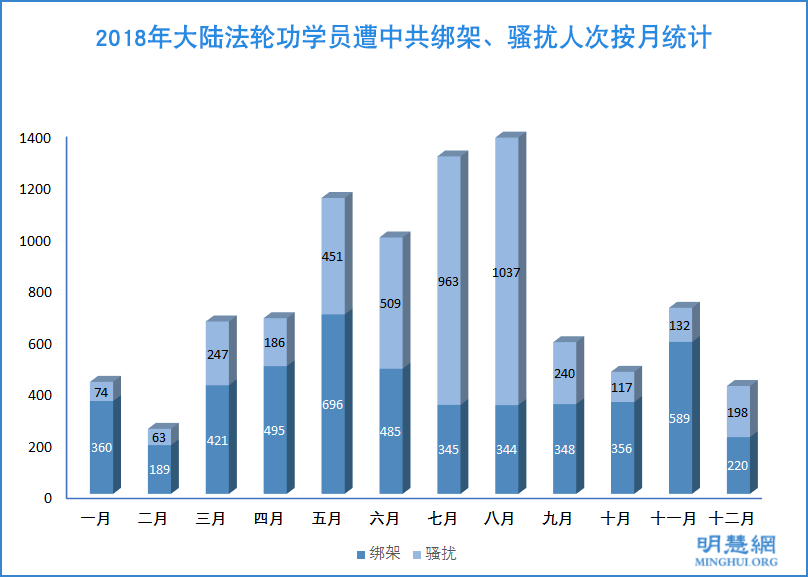 ![]() 图2:2018年大陆法轮功学员遭中共绑架、骚扰人次按月统计 |