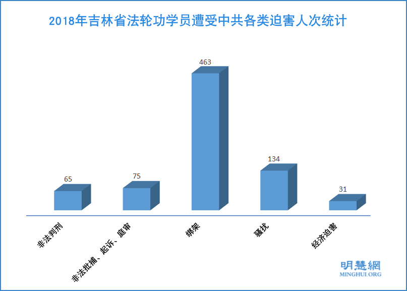 ![]() 图1:2018年吉林省法轮功学员遭受中共各类迫害人次统计 |