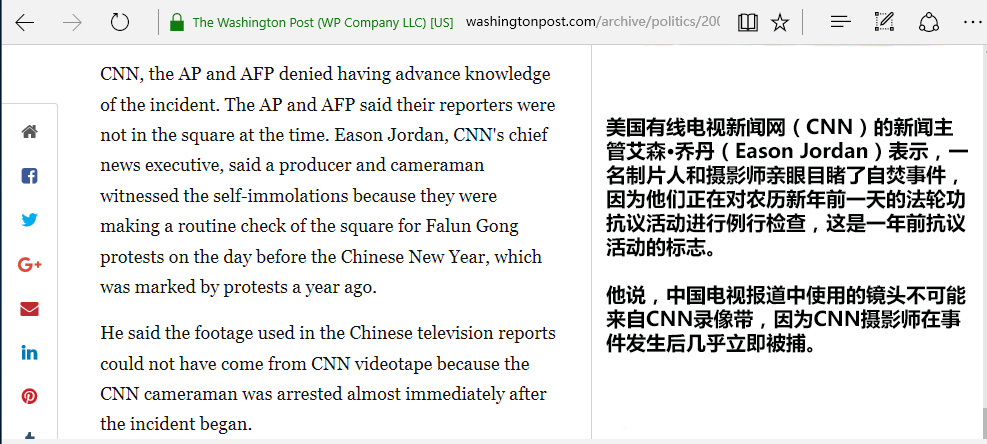 ![]() (《华盛顿邮报》二零零一年二月九日报道,CNN否认《焦点访谈》特写镜头来自CNN) |