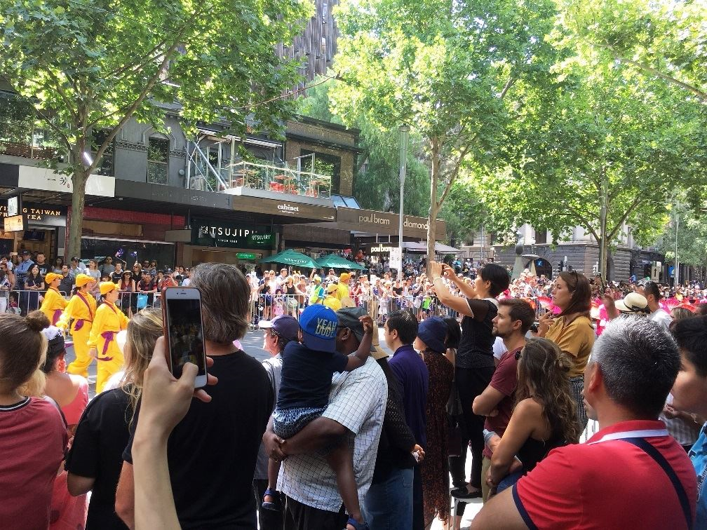 各族裔法轮功学员组成亮丽的游行队伍,把“真善忍”的普世价值和法轮大法的美好带给澳洲文化之都的各族裔民众。祥和的五套功法展示、优美的扇子舞以及喜庆的腰鼓表演,吸引人们纷纷拍照录影,从主席台上台下的嘉宾到旅游度假的大陆客,都被纯正的能量、绰约的舞姿、清脆激昂的鼓声激赏感佩。