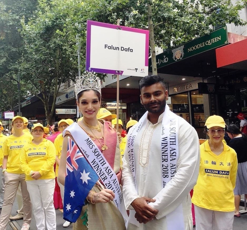 ![]() 图5:分别获得2018年度“澳大利亚南亚夫人、先生”桂冠的塔瑞丽·费尔南多(Dr Tarini Fernando)(左)和尼杉·约瑟夫(Nishan Joseph),与法轮功学员队伍合影。 |