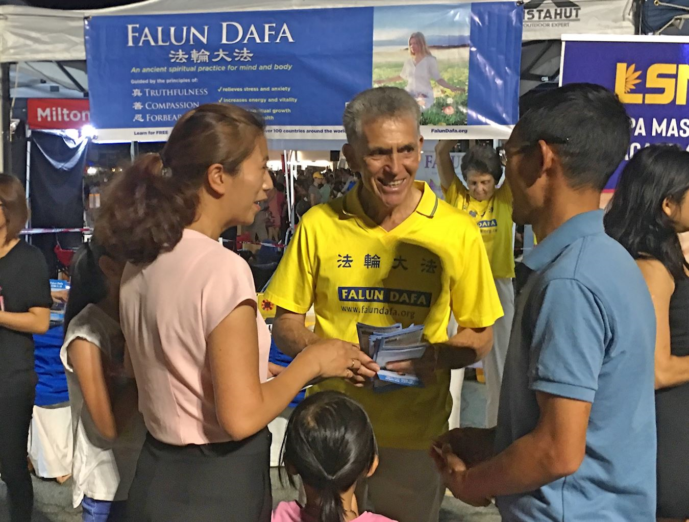 杜安(Doan)是一位越裔澳洲公民,他在法轮功学员的展位前认真观看了教功录像,并对学员说:“我早就听说过法轮功了,很早就想炼了,今天终于见到了你们!”他仔细询问了越南社区学员每周集体炼功的时间和地点,说周日一定要去学习五套功法。最后,杜安在再三确认了集体炼功时间和地点后,拿着真相资料开心离开。