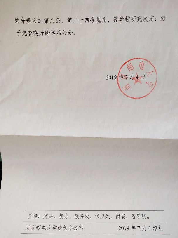 下面两个文件是二零一九年八月二十五日开学后,宛春晓与家人到学校进行交涉,学校才给她的文件,之前只是口头通知,并给看了一眼一张写着“处分令”三个字的纸,并没有交给她。宛春晓的电子学籍是八月二十七日才显示不在籍的,离校时间写的七月四日。