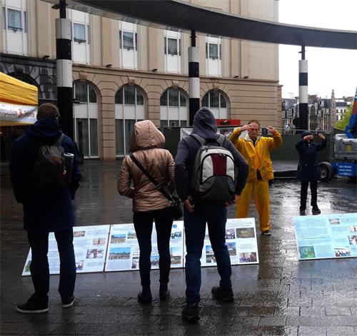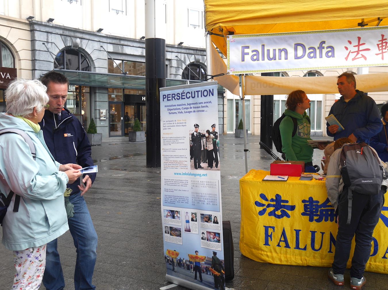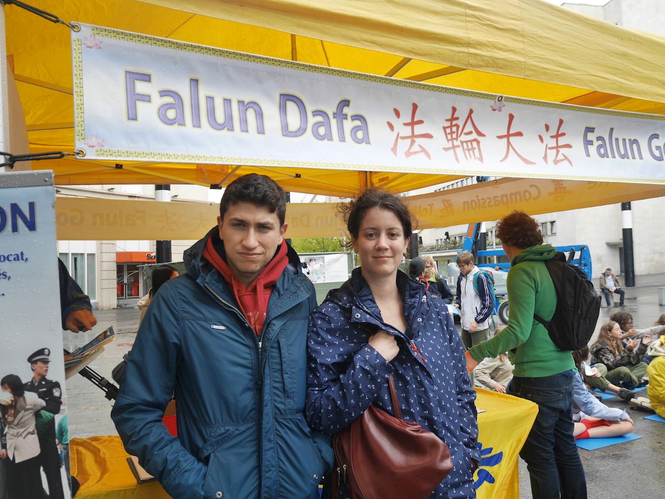 建筑师内费尔·伊苏阿(Nefell Isoua)和工程师哈莱瓦·拉空(Halewa Lakov)路过法轮功学员的展位。看过展板后,在经过长时间与法轮功学员的交谈后,愿意接受采访,他们说,之前不知道中共活摘器官残酷迫害法轮功的事情,所以他们希望了解更多真相。学员告诉他们为制止这场迫害,法轮功学员坚持了二十年,不懈地揭露中共的残暴与谎言欺骗,向各国人民讲法轮功真相。当他们听到欧盟、美国都在谴责中共的迫害,最近比利时政府制定新法律,对非法器官来源的器官手术患者即以罚款;以及曾经百万联署制止中共迫害法轮功交与联合国人权委员会;他们非常赞同这些做法,他们认为世界需要“真善忍”,并立即留下自己的签名和联系方式,支持反迫害;他们感谢法轮功学员使他们了解迫害真相。