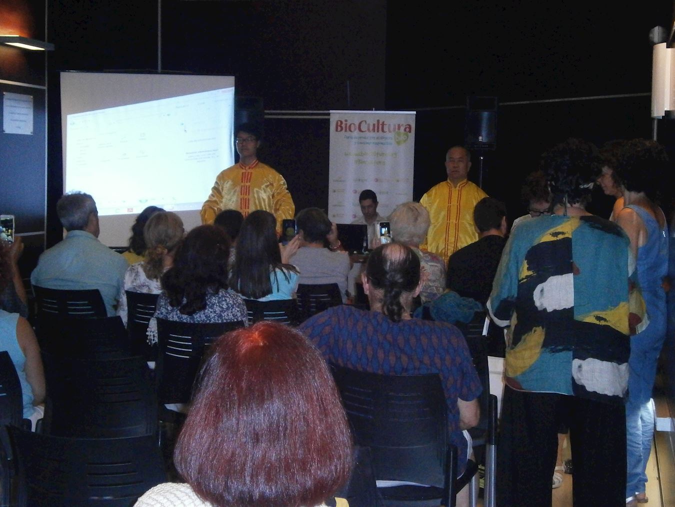 28日下午两点,法轮功学员在会展的临时会议厅里举办了一个小型讲座,内容分为法轮功简介和功法演示。