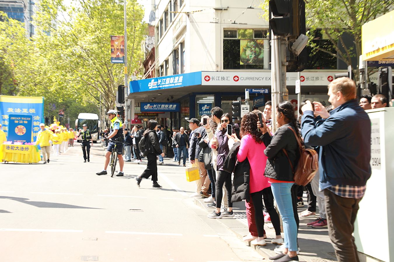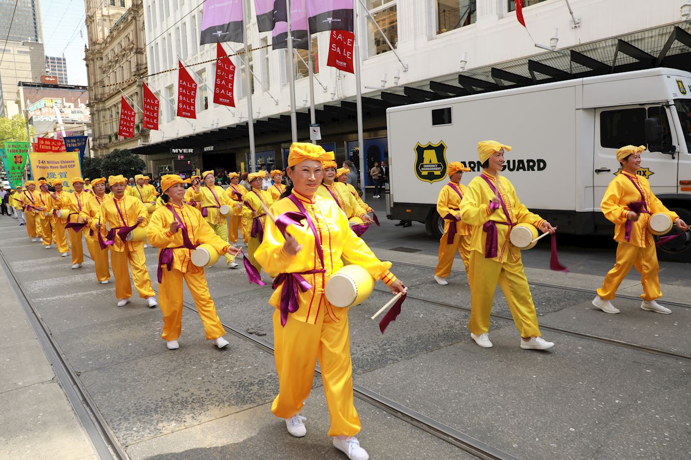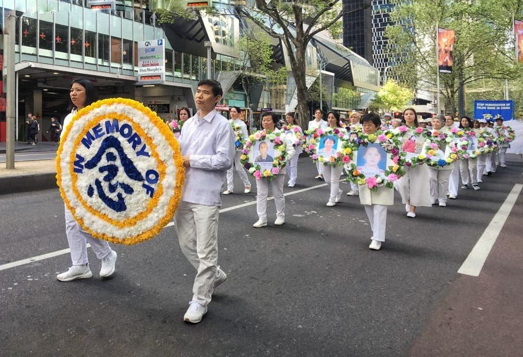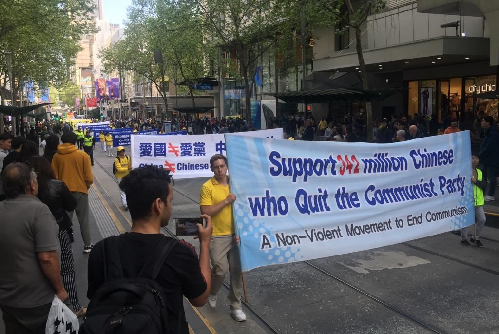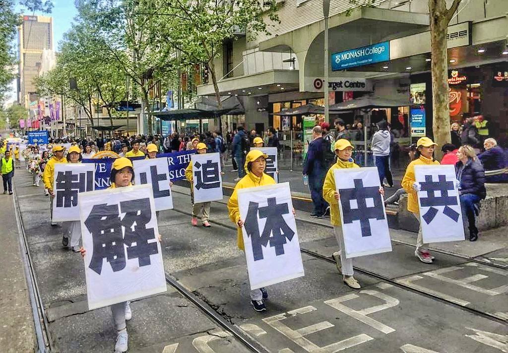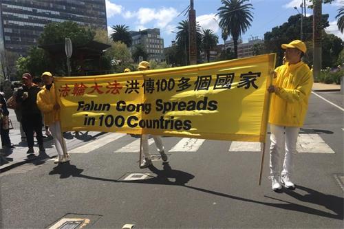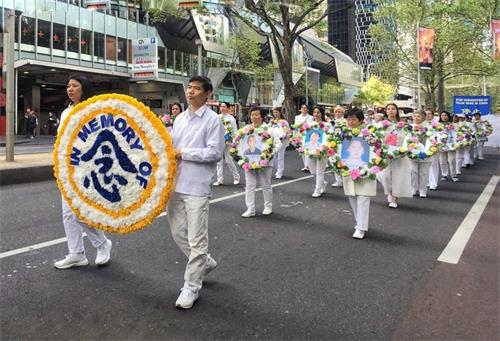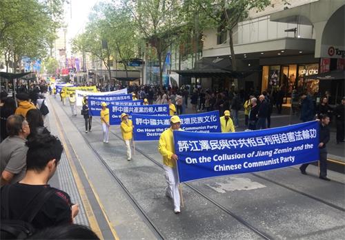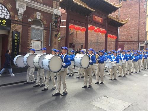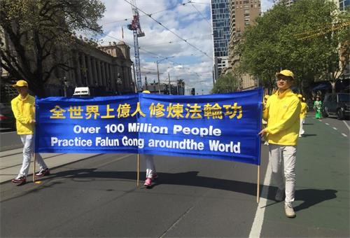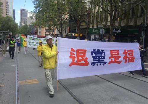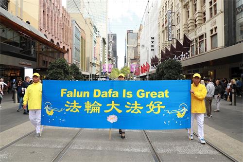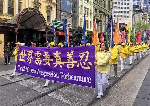 中午时分,游行队伍从维多利亚州议会大楼附近的财政花园(Treasury Gardens)出发,由天国乐团奏响“法轮大法好”拉开大游行的序幕,气势雄壮威武。游行队伍还包括“法轮大法好”、“和平理性反迫害”、“声援三亿四千万中国勇士退出中共党团队”等主题方阵。浩浩荡荡的游行队伍途径最繁华热闹的街道,熙熙攘攘的游客和当地民众感受到法轮功学员们传递的美好与希望。