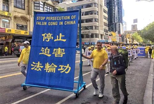 来自美国佛罗里达的艺术家罗伯特·里德(Robert Reed)和查尔斯·狄波利斯(Charles Dipaolis)在墨尔本做短期旅游,当天在唐人街观赏到游行,狄波利斯表示:“几年前,在新闻中我们读到了有关迫害的文章。知道在中国发生什么事情后我们感觉很难过。”