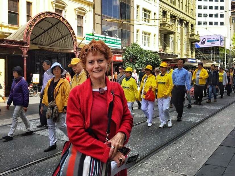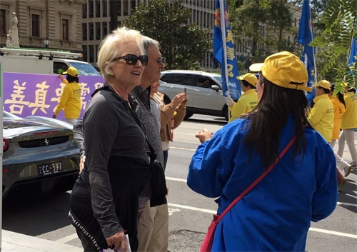 墨尔本居民简(Jan)感叹说:“法轮功学员们在维护人道、保护受迫害的人,也在伸张正义。”“整个游行太棒了。法轮功学员在做一件很了不起的事情。”