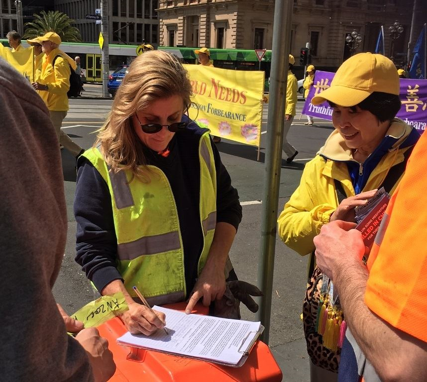 “我们都是人,都有同样的权利,他们(法轮功学员)站出来反对暴政勇气可嘉、很可贵。中共迫害之惨烈让很多人都觉得难以置信,所以希望澳洲人能了解这一切,能帮助做些什么。”